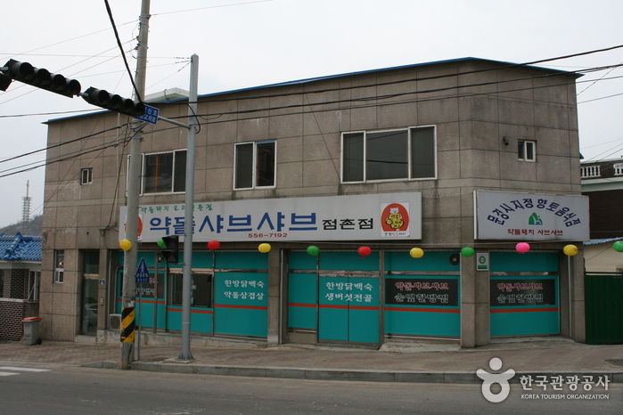 문경시 농업기술센터가 게르마늄 성분 등이 들어있는 거정석을 사료첨가제로 먹여 키운 약돌돼지는 돼지 특유의 누린내가 없고, 육질이 쫄깃하고 부드럽기로 유명하다. 특히 우리 몸에 이로운 불포화 지방산과 필수 아미노산이 함유되어 건강에 좋고 밤, 대추, 인삼 등 몸에 좋은 한약재료를 넣어 끓인 맑은 육수에 청정지역에서 자란 깨끗하고 신선한 야채를 살짝 데쳐서 함께 먹는 돼지고기 샤부샤부의 맛은 그 깔끔함이 일품이다. 거기다 갖은 한약재를 넣어 만든 건강한방찜 역시 이곳의 대표 메뉴로 성인병 예방에 탁월하다.