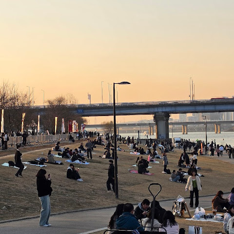 저희는 BTS 아리랑 공연 관람을 위해 이곳에 왔습니다. 원하시면 아름다운 경치를 감상하며 간단한 피크닉을 즐기실 수 있습니다. 피크닉 매트 대여도 가능합니다. 지하철 5호선을 타고 여의나루역 2번 또는 3번 출구로 나오시면 됩니다.
