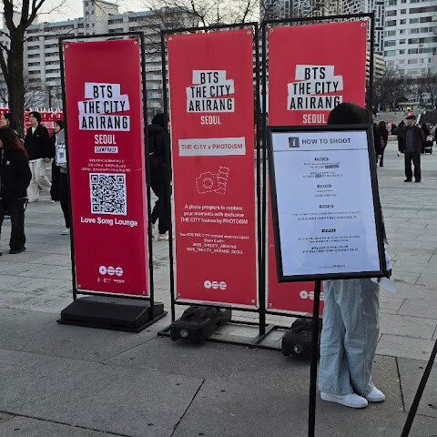 BTS 컴백 전시회도 열려서 보라색, 분홍색 등 다양한 조명으로 화려하게 꾸며져 매우 혼잡했습니다.