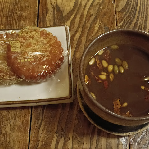우리 셋은 각각 음료 한 잔을 주문하고 조청과 함께 먹는 가떡, 유자차, 모과차(작은 파파야의 일종), 쌍화차(약간 쓴 나물)를 먹었다.