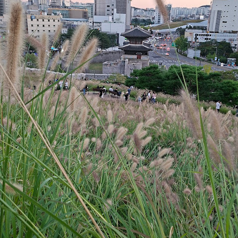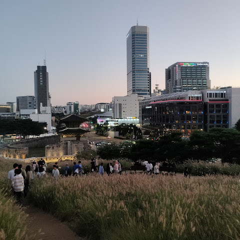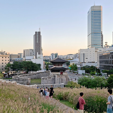 이 지점에서 남산 성곽길을 따라 오르막길로 짧은 하이킹을 시작했습니다. 이곳은 남산타워를 배경으로 동대문과 주변 지역의 인상적인 전망을 감상할 수 있는 곳입니다. 돌담길을 따라 하이킹하며 역사를 느껴볼 수 있고, 잠시 쉬어갈 수 있는 아늑한 휴식 공간도 있습니다. 매일 운동을 하러 양쪽으로 산책하는 현지인들을 몇 명 볼 수 있을 것입니다.