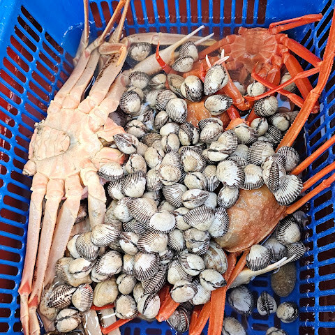 달콤하고 맛있는 해산물의 자유를 만끽하세요! 다양한 종류의 게 외에도 수류탄만큼 큰 지역산 전복과 먹장어를 강력 추천합니다. 정말 저렴하죠. 구매 후 2층에서 해산물을 조리해 드실 수 있습니다. 신선하고 맛있겠죠?
