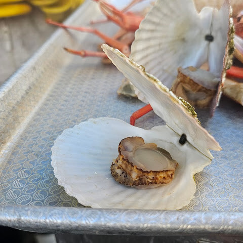 게의 무게를 재어 보시고 저희가 좋아하는지 확인하시고 가리비 두 개를 주셨습니다.