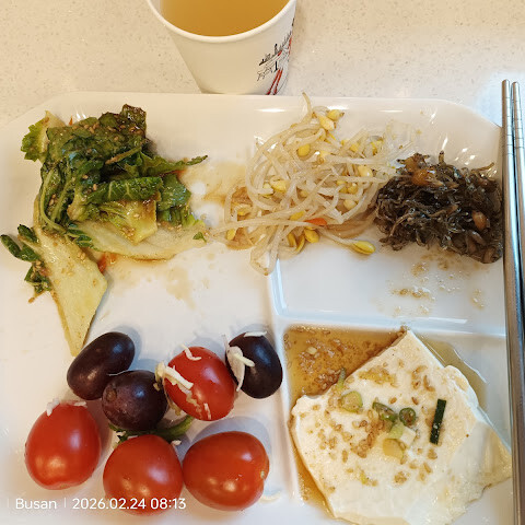 조식에는 찹쌀죽, 두부, 토마토가 나왔는데, 아주 건강하고 맛있었어요! 😄