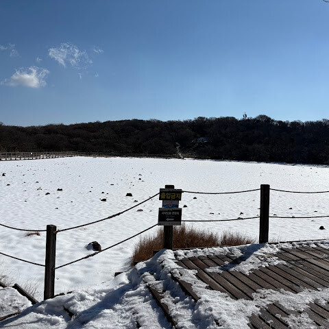 겨울 눈덮힌 사라오름 탐방 . 산정호수가 얼어 겨울왕국을 이룬다. 흐린 날이었지만 가끔씩 걷히는 구름 사이로 파란 하늘과 한라산 정상이 보인다.