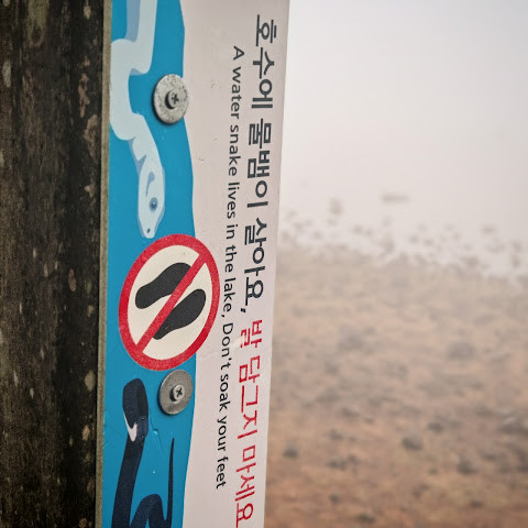 성판악에서 2시간 반이나 꾸역꾸역 걸어올라왔는데, 비가 오니 아무 것도 안보입니다. 한라산은 고사하고, 사라오름에 있는 연못도 바로 앞에 물이 있는 것만 보이고 전체적인 크기는 가늠이 되지 않습니다.
