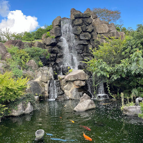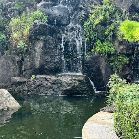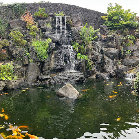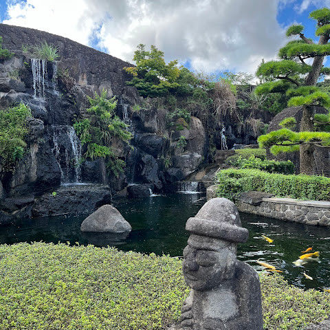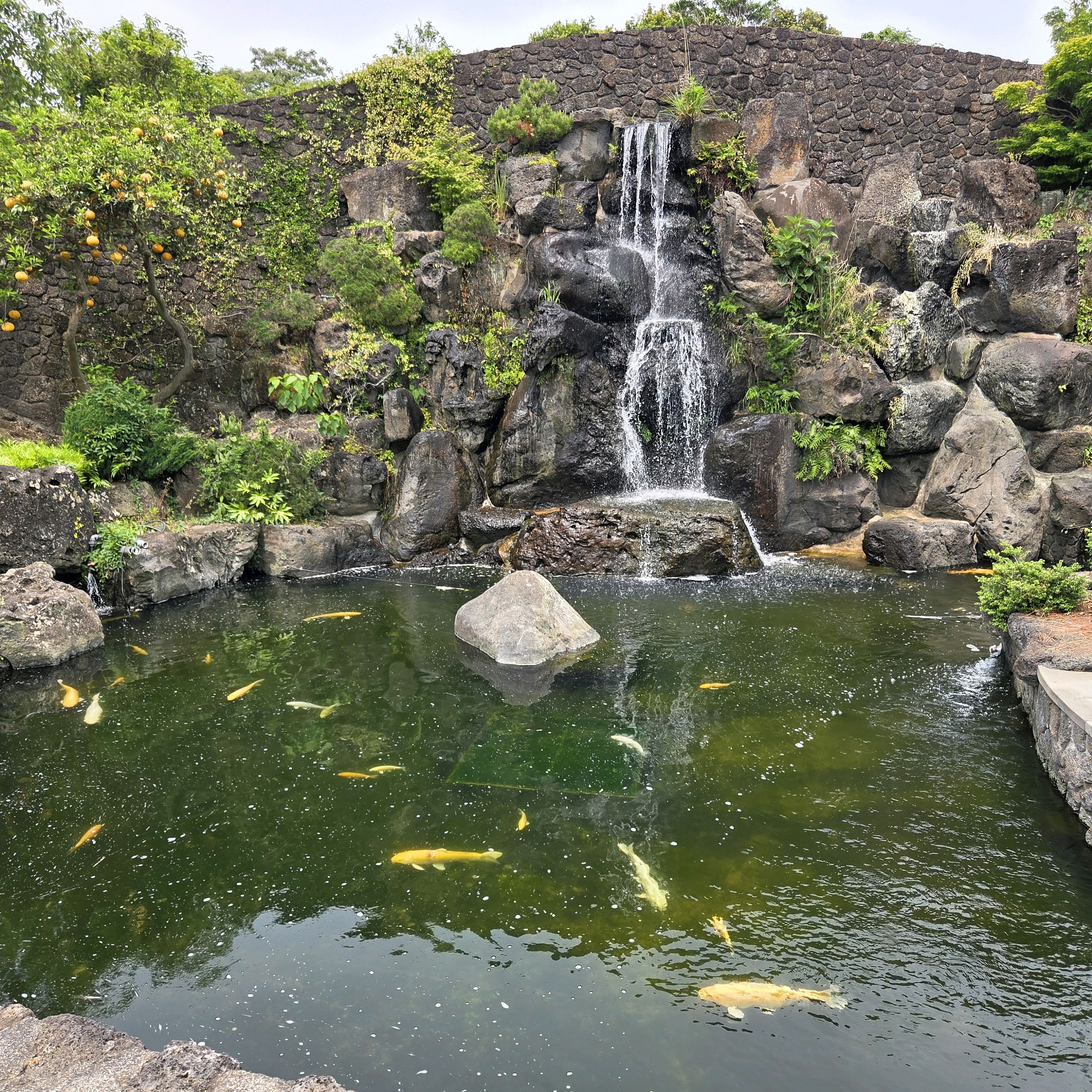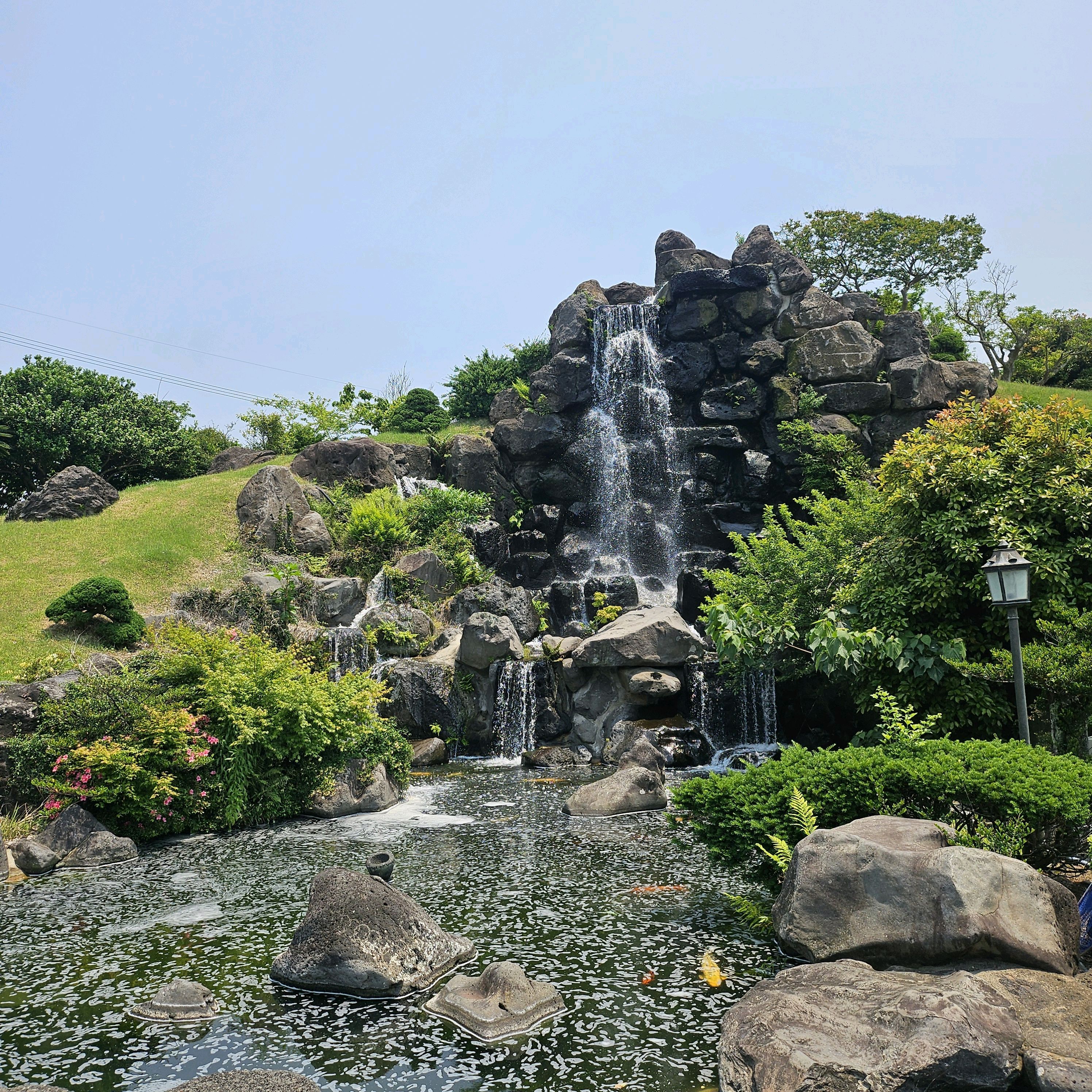 이 정원은 연못, 분재, 조각품, 열대 식물, 그리고 아름다운 폭포가 어우러진 곳입니다.