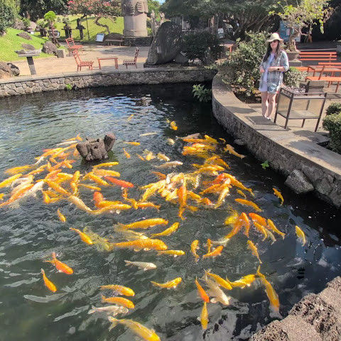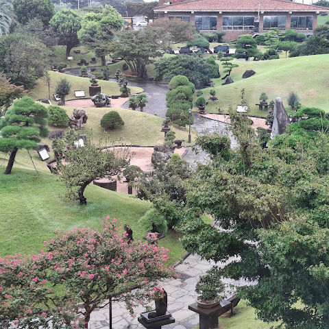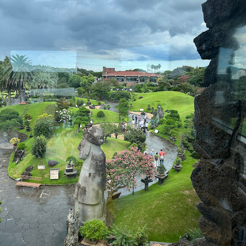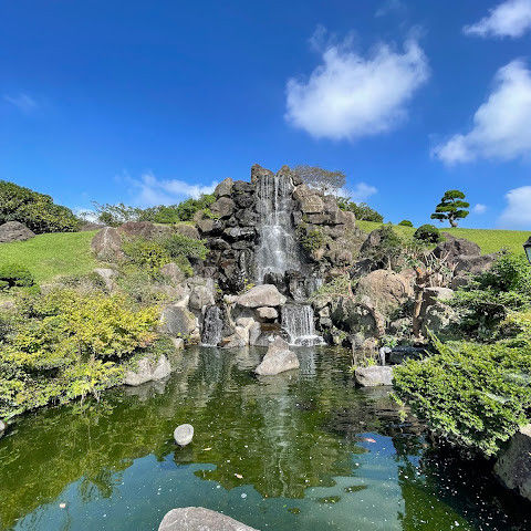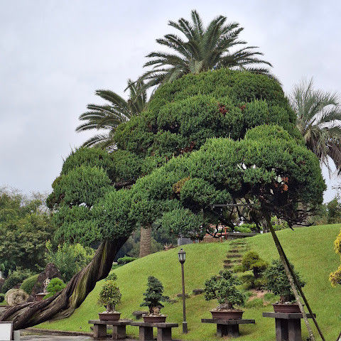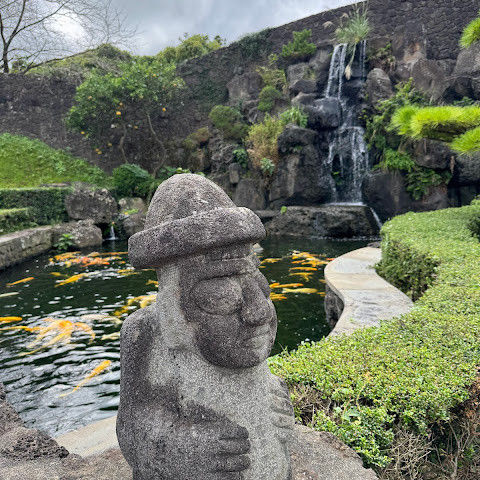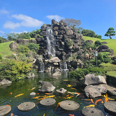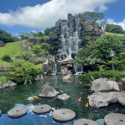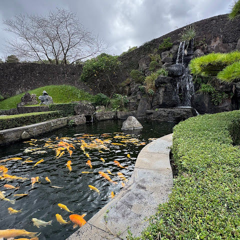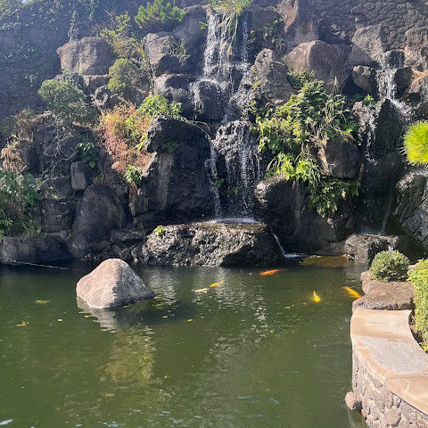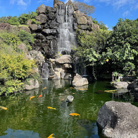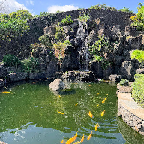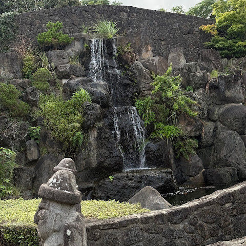 이 정원은 연못, 분재, 조각품, 열대 식물, 그리고 아름다운 폭포가 어우러진 곳입니다.