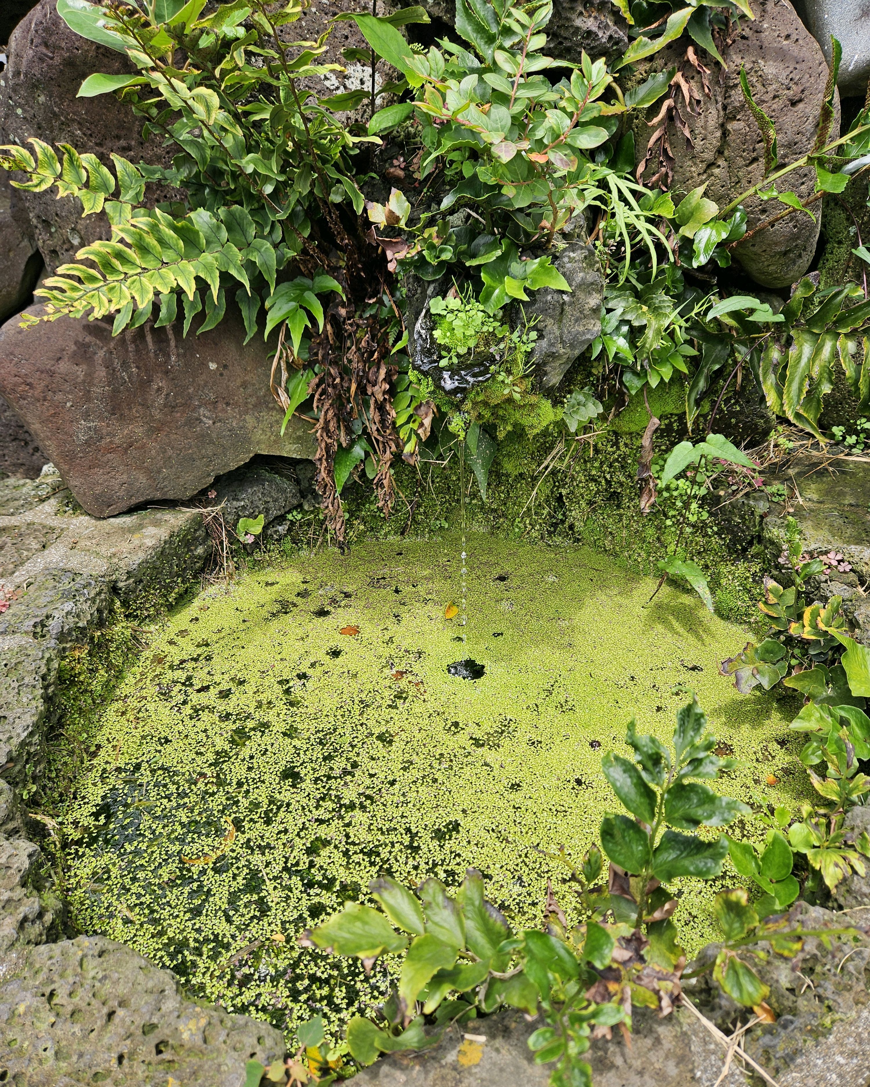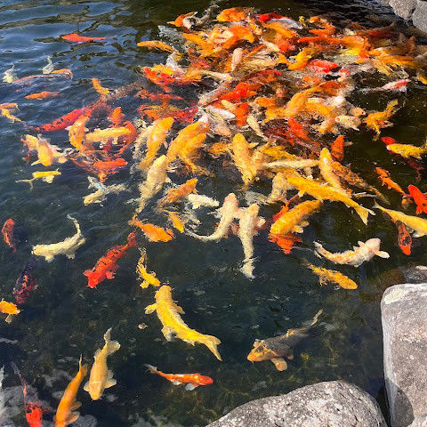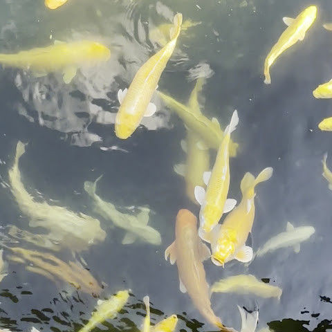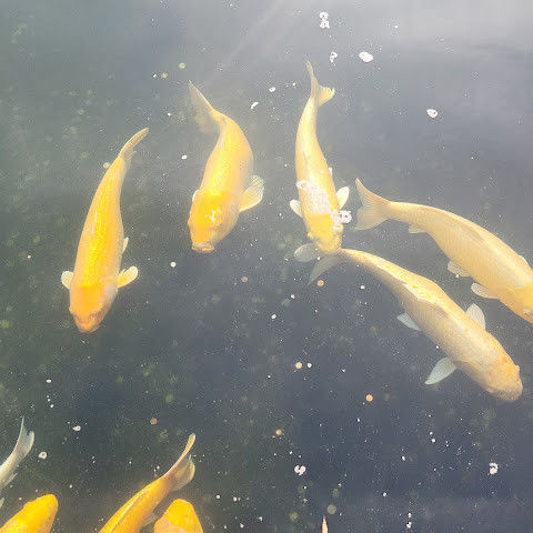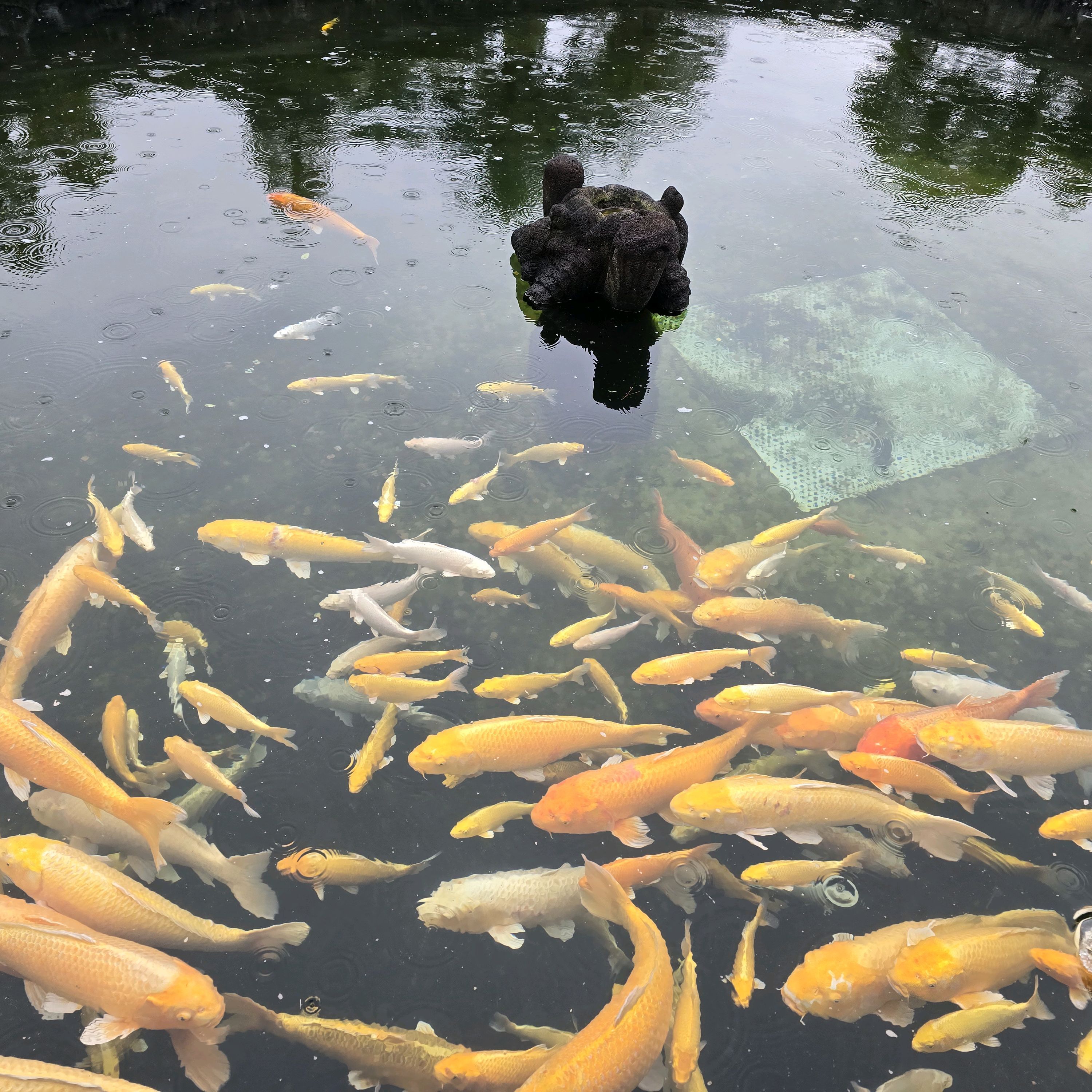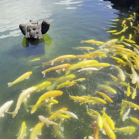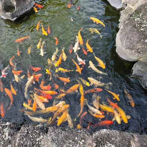 연못에는 잉어가 많이 있는데, 소정의 요금을 내면 먹이를 줄 수 있습니다.