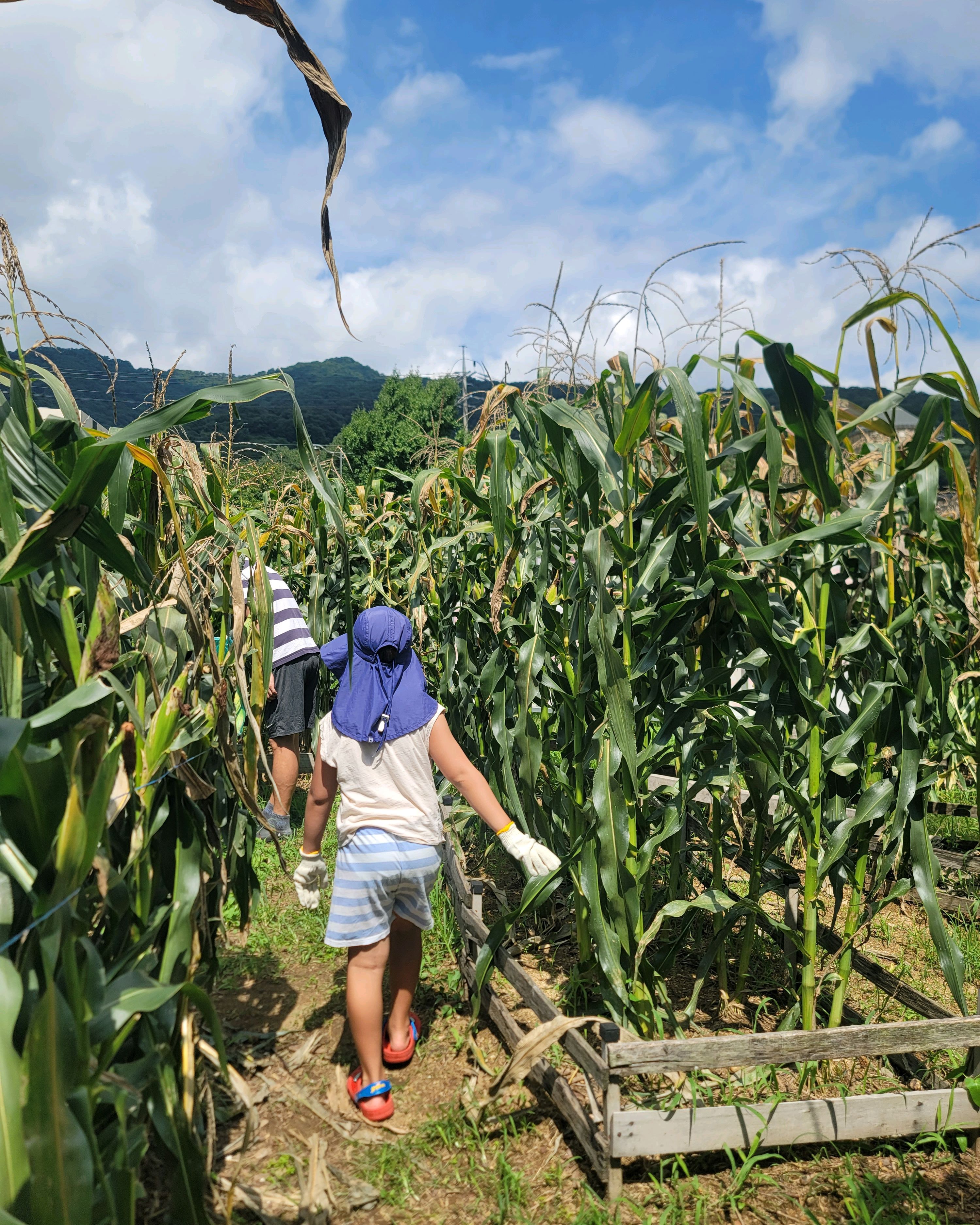 아이들이 옥수수를 따는것을 귀엽다는듯 바라봐주시고 도와 주십니다 옥수수밭도 아이들이 미로처럼 돌아다니게 심으셨습니다