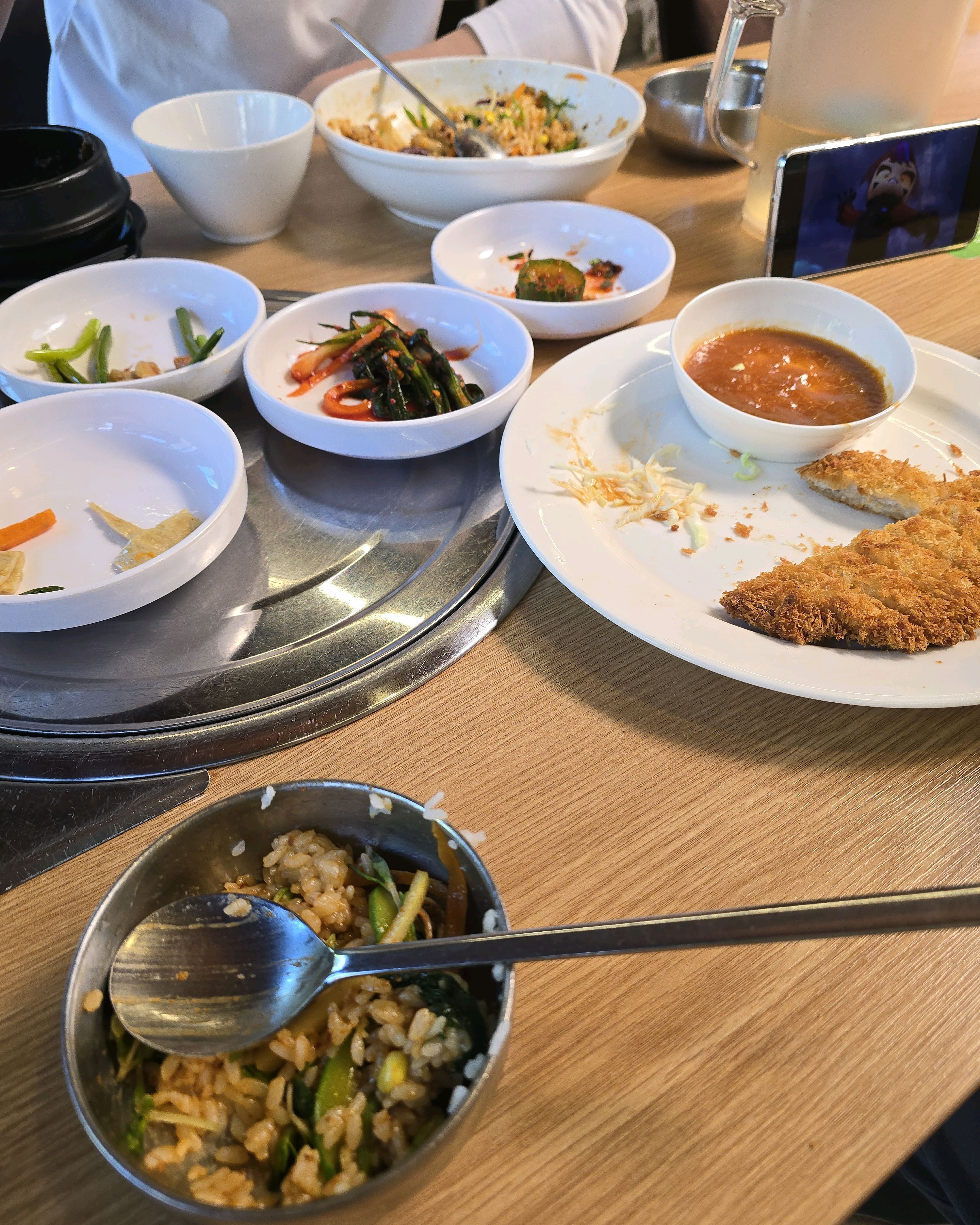 오랜만에 찾은 서운동산에서 숙박하고 푸릇푸릇한 예쁜 산책로 산책 후 맛난 점심까지. 김치전이 너무 맛나요!! 아이도 돈까스를 넘 잘 먹네요.