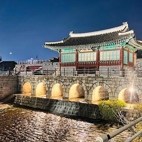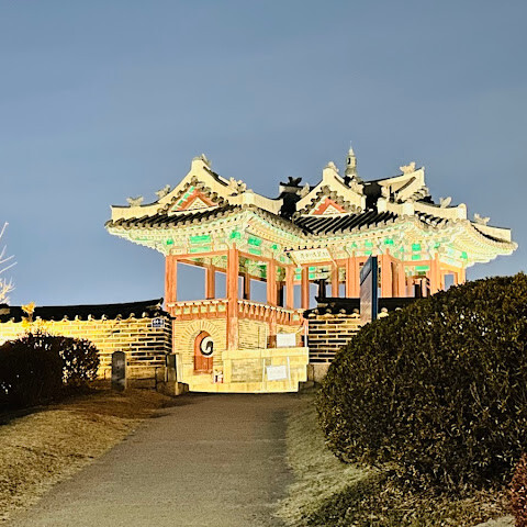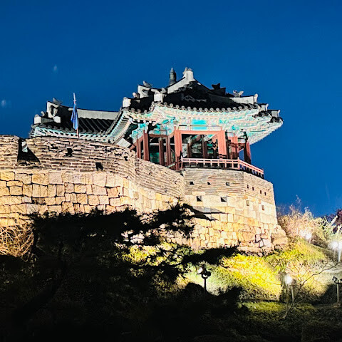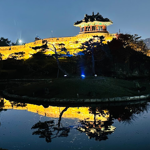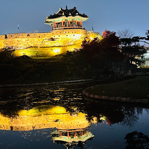 저녁에 화성으로 돌아와 야경을 감상했습니다. 불을 밝힌 화성 성벽과 화화수원, 화홍문은 마치 한 폭의 그림 같았습니다. 낮보다 덜 북적이는 화성의 밤은 고요하고 낭만적인 분위기를 자아내 산책하기에 더할 나위 없이 좋은 곳이었습니다.