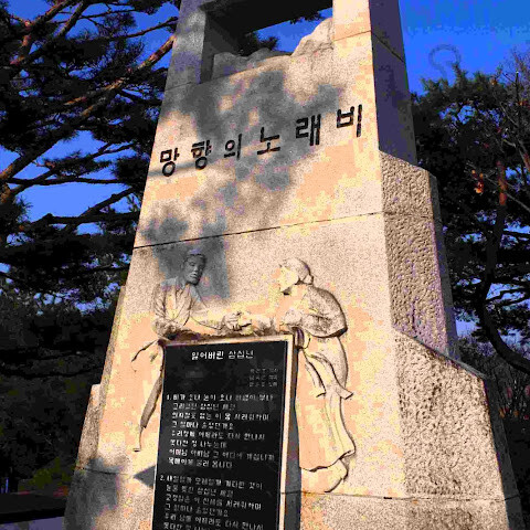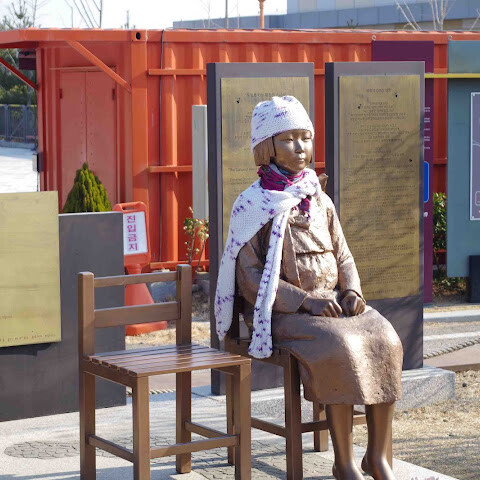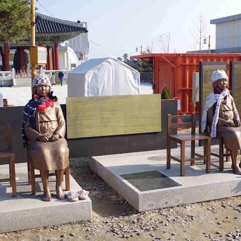 우리는 비무장지대(DMZ) 투어를 예약했고, 첫 번째 목적지는 관광 안내소였습니다. 그곳에서 자유의 다리, 위안부 기념비(일본 점령기 동안 군인들의 성적 유흥을 위해 이용되었던 여성들), 열차, 한국 전쟁 기념비들을 둘러보았습니다. 관광 안내소에는 북한 동전을 파는 기념품 가게와 여행객들을 위한 식당들도 있었습니다.
