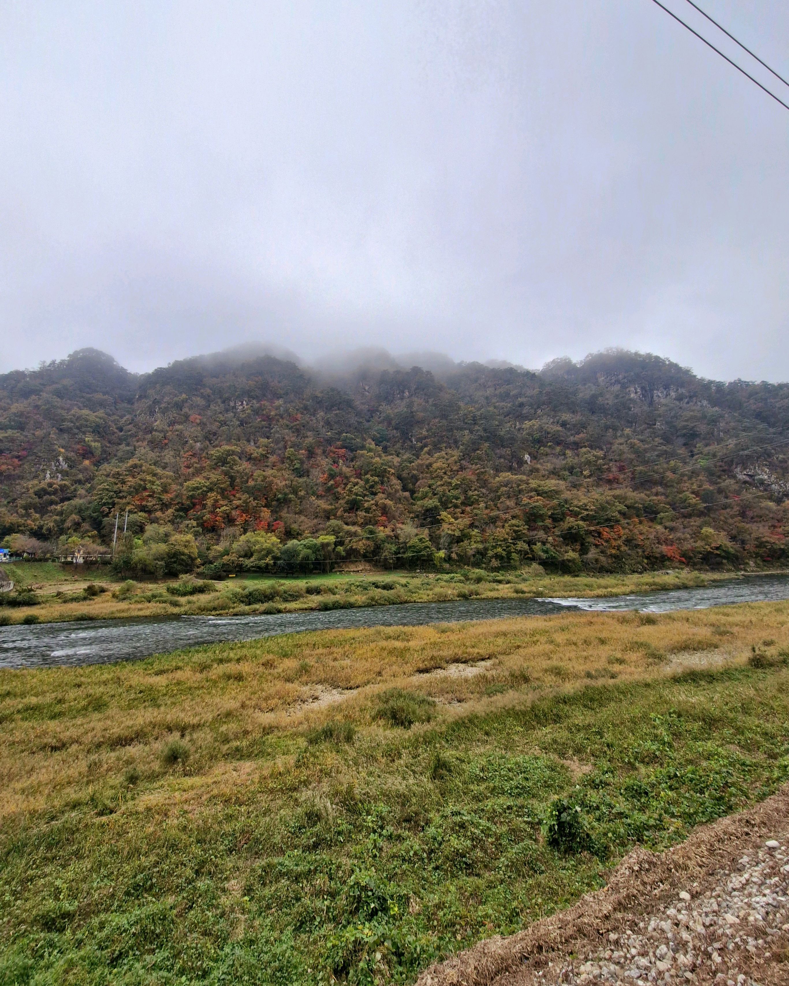 제가 간 날은 완전 곰탕이라 3봉에서 보는 아름다운 팔봉산과 홍천강 뷰를 볼 수 없었지만, 부분부분 물든 단풍🍁도 예뻤고, 해산굴 통과도 재미있었습니다! 그리고 8봉에서 하산 후 홍천강을 따라 이어지는 길도 좋았어요.