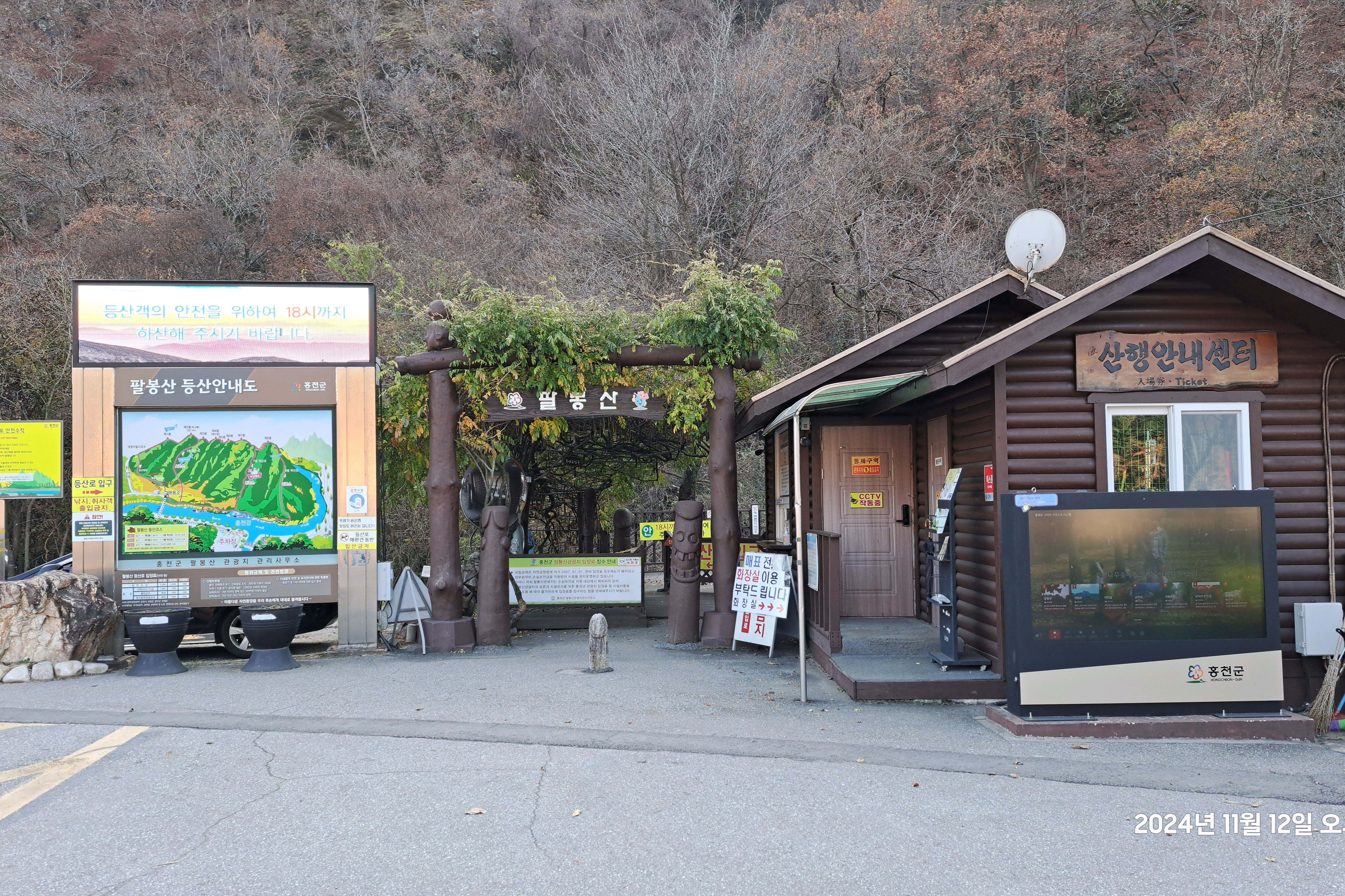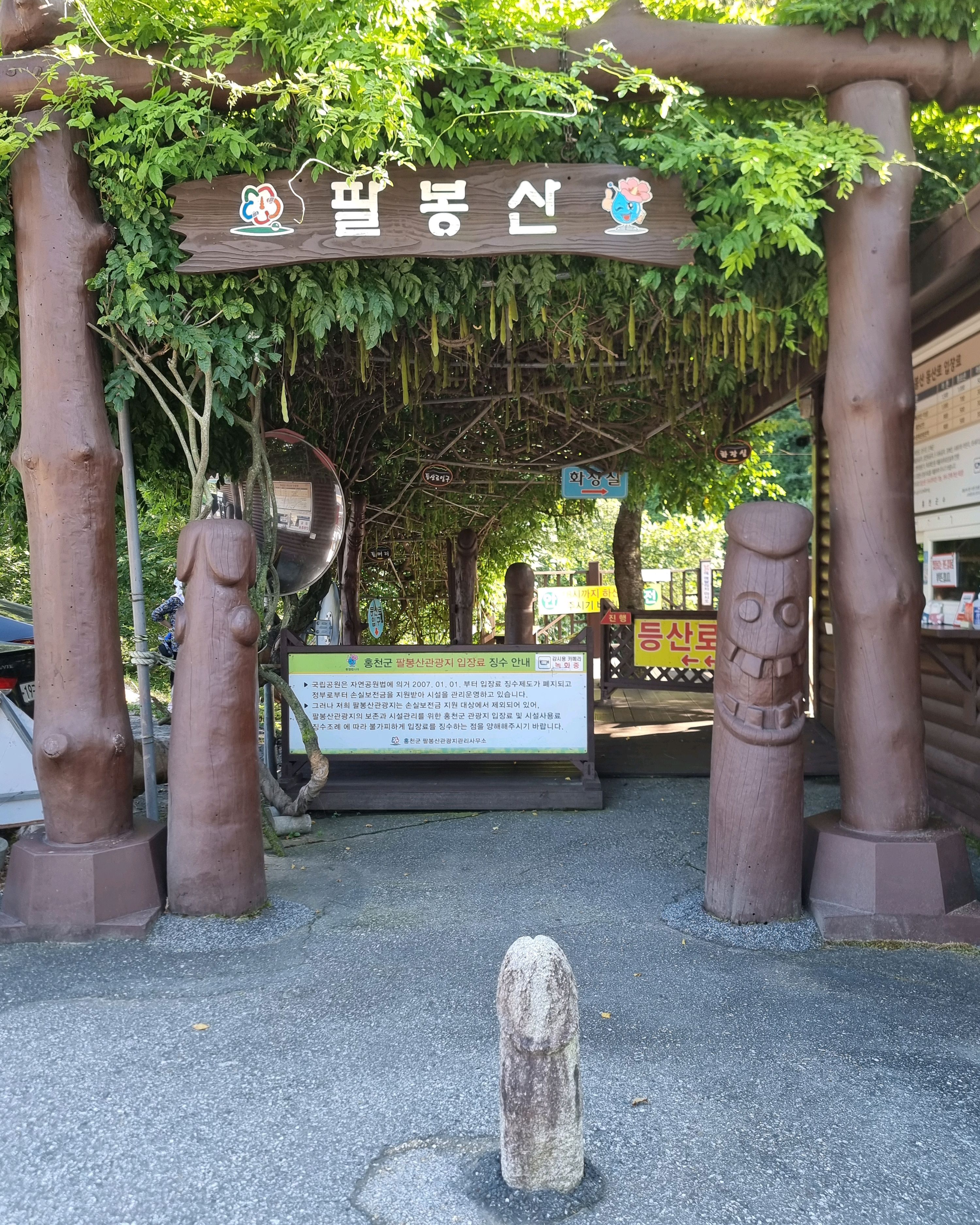 팔봉산관광지 주차장에 무료 주차 후 홍천강 따라 걷다가 팔봉교를 건너자마자 들머리 입니다. 입장료 1500원입니다.