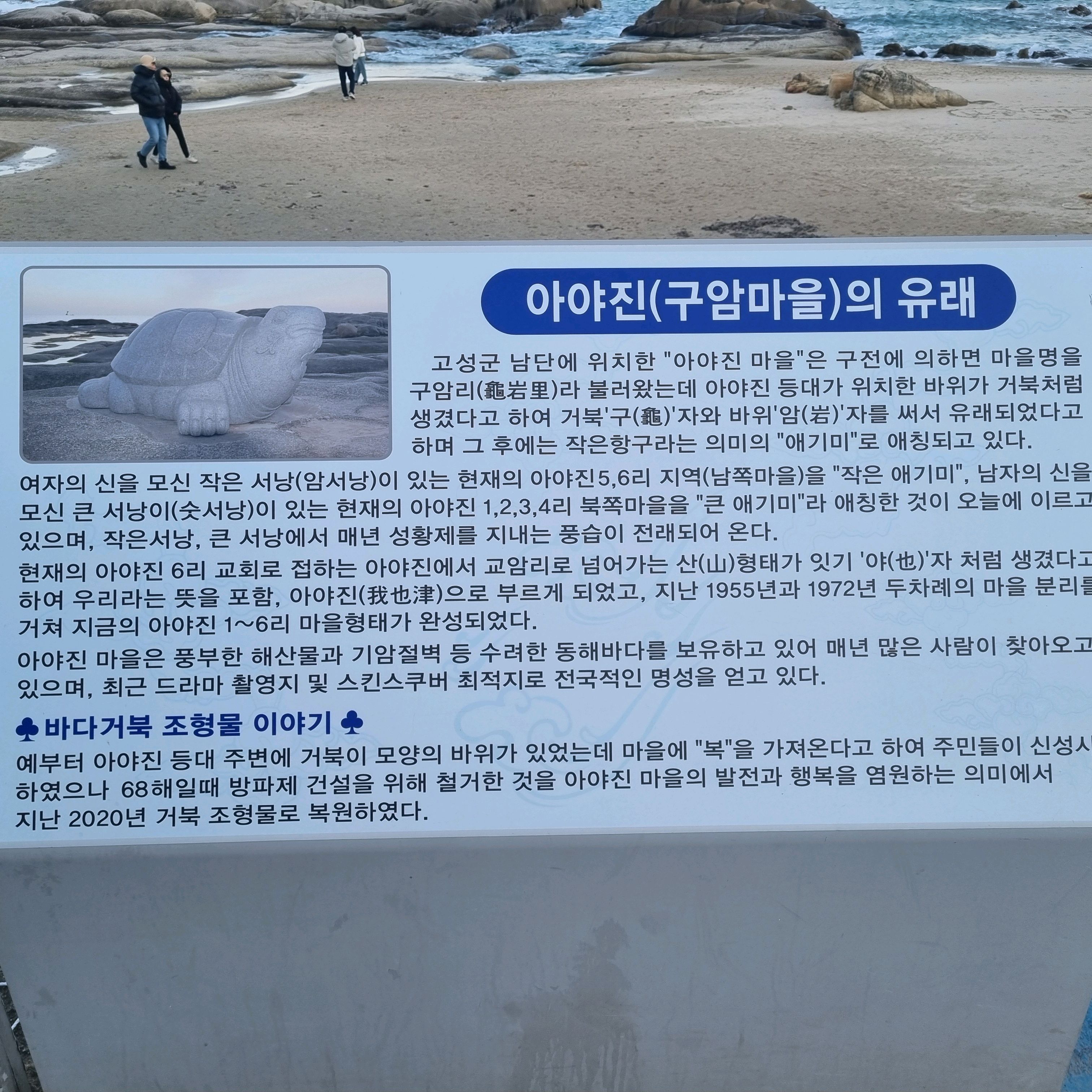 |  저녁시간때 방문이라 주차는 편했지만 성수기 시즌때는 어려울것 같습니다. 아야진 명물 바다거북 조형물도 봐서 좋았습니다. 2025년 01월 27일 |
