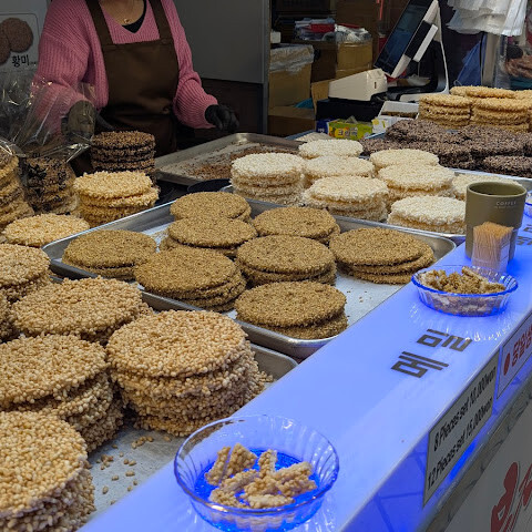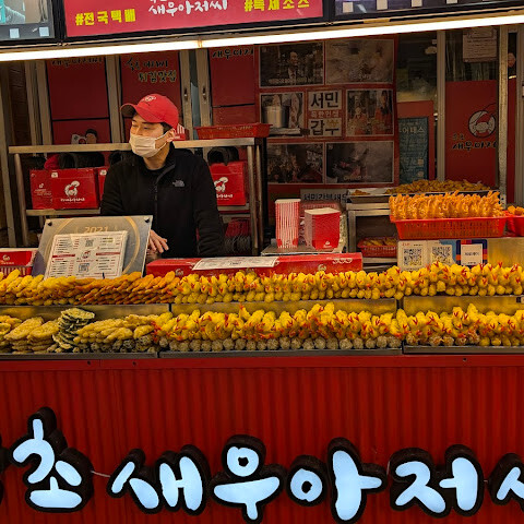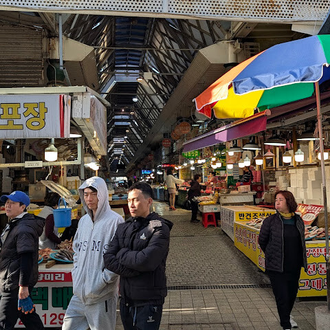 속초에서 방문하기 좋은 시장. 주변에 상점이 많습니다. 우리는 여기에서 좋은 현지 특산품을 시험해 보았습니다. 저희는 주말에 방문해서 사람이 많았어요
