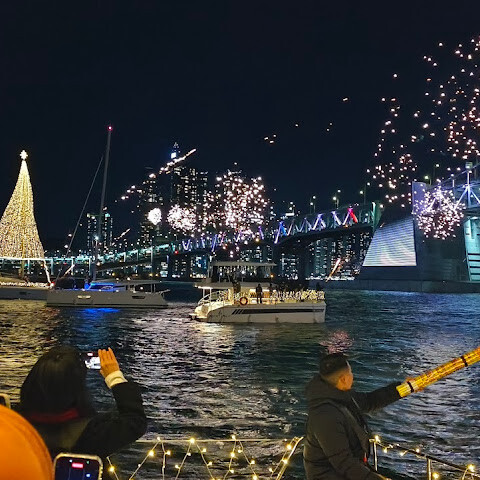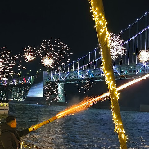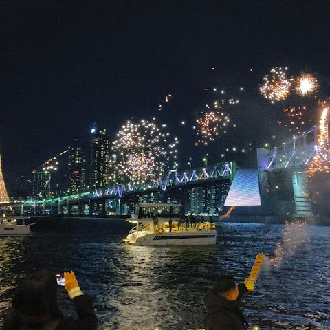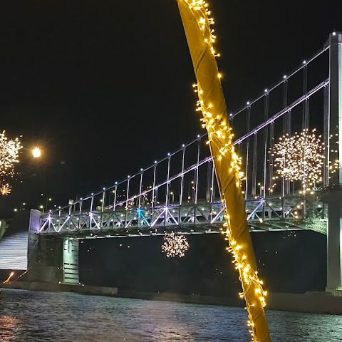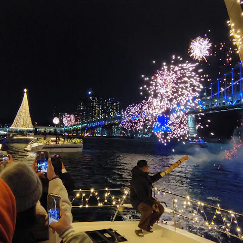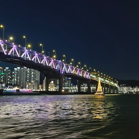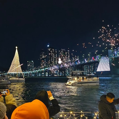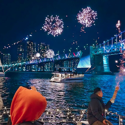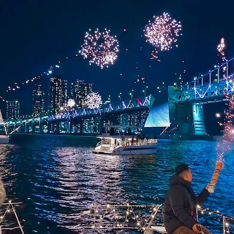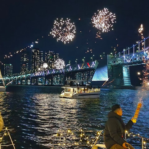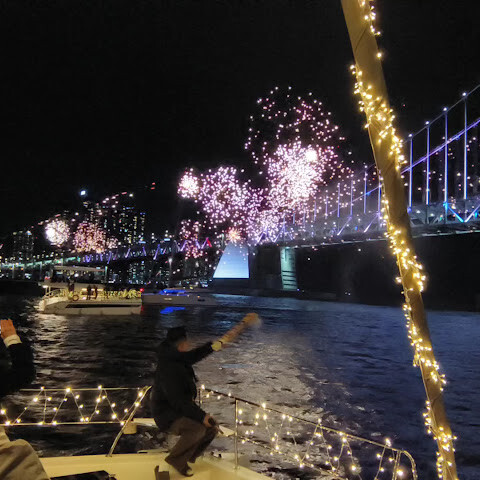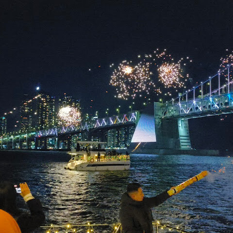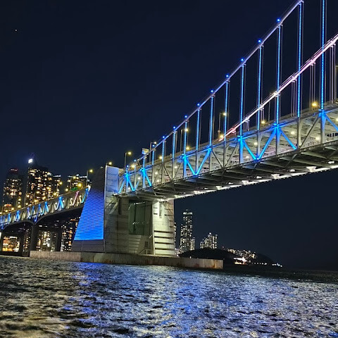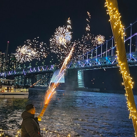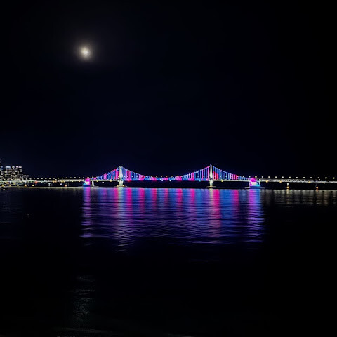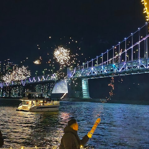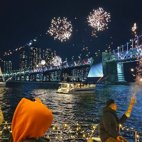 다리에서 나오는 불빛과 건너편 도시가 어우러진 밤 풍경이 정말 아름다웠어요. 멀리서 작은 불꽃놀이를 하는 배들도 보였고요!