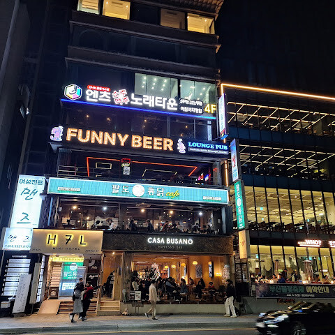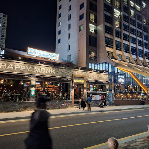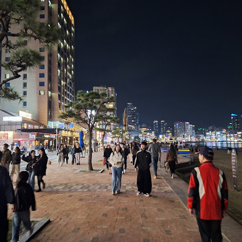 광안리에는 먹고, 마시고, 앉아 경치를 감상할 수 있는 곳이 정말 많습니다. 음악과 다양한 즐길 거리도 있습니다. 저희는 해운대 해수욕장을 방문했는데, 좀 더 고급스럽고 비싸면서도 덜 붐비는 느낌이었습니다. 광안리의 활기가 더 좋았습니다.