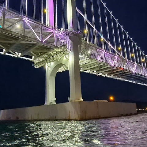 다리에서 나오는 불빛과 반대편 도시가 어우러진 밤 풍경이 정말 아름다웠어요. 멀리서 작은 불꽃놀이를 하는 배들도 보였고요!