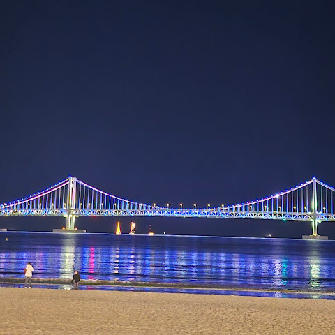 밤에도 화려하고 광안대교가 불빛이 다양해서 멋지구요 낮에는 바다가 푸르고 파도가 굉장합니다. 모래사장위에 파라솔과 의자가 있어 앉아서 쉬기도 좋아요. 새해맞이 불빛터널고 멋지구요. 모래사장도 크고 넓어요. 여름엔 서핑하기도 물놀이하기도 좋을거 같아요!^^ 주변에 카페랑 맛집이랑 호텔도 많습니다^^