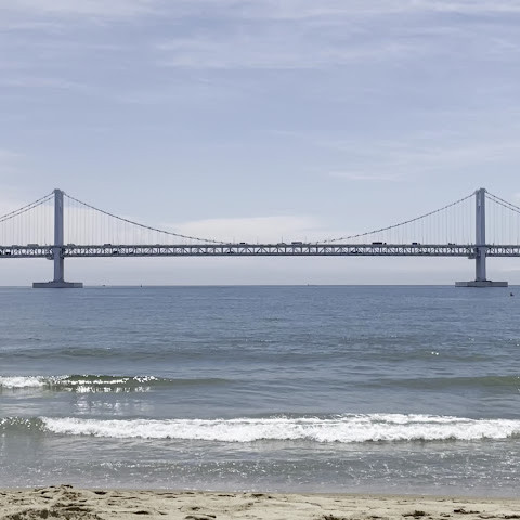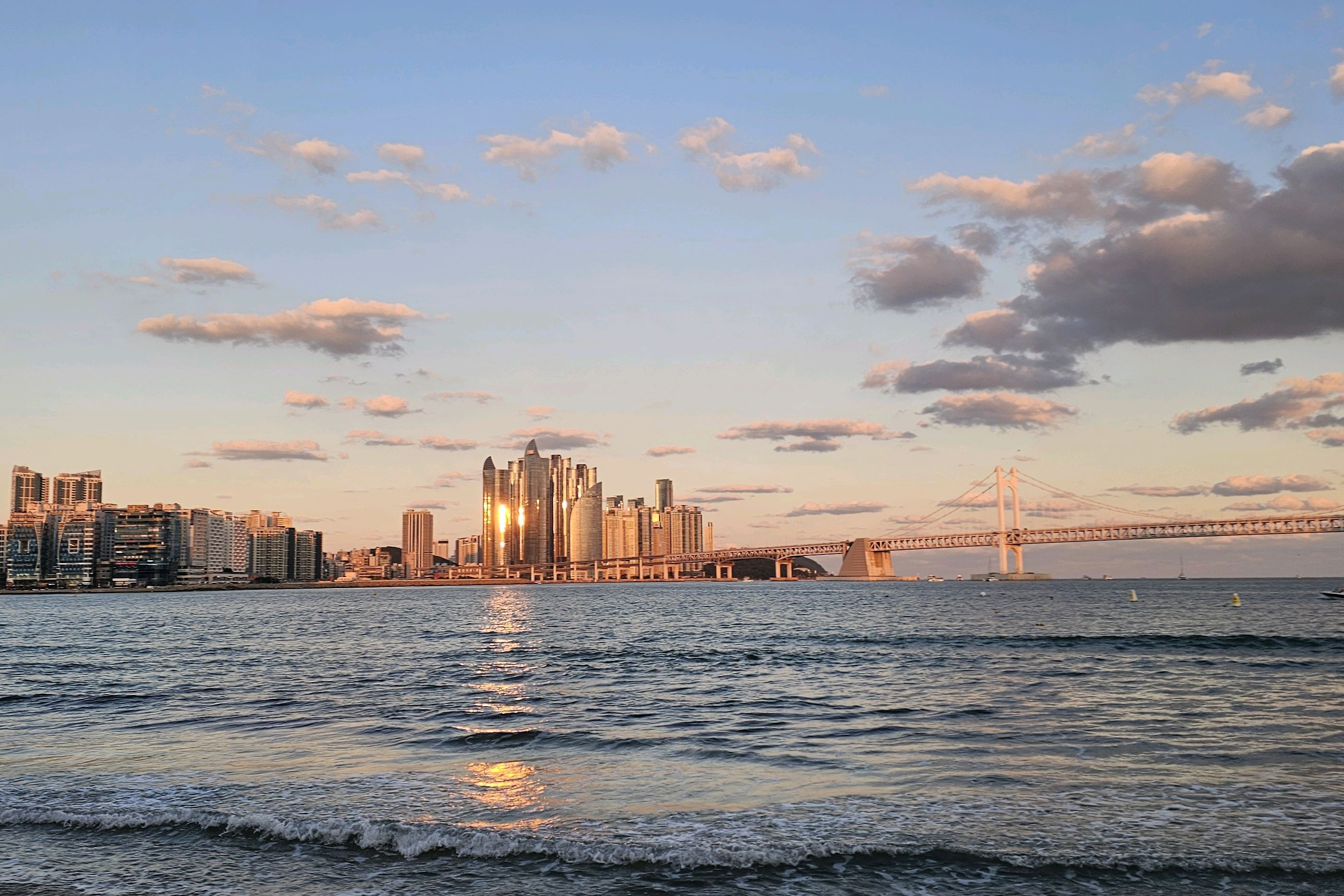 |  부산에 처음 온 베트남 사람입니다. 이곳 바다가 정말 마음에 들어요. 맑고 푸른 바닷물이 하늘과 어우러져요. 저 멀리 이곳의 상징인 다리가 보이네요. 오후 4시부터 저녁까지 여기서 놀았는데, 오후와 저녁 시간대의 다양한 즐길 거리가 있었어요. 하루가 끝날 무렵, 하늘의 색이 정말 인상적으로 변하는 모습을 볼 수 있었어요. 2025년 09월 20일 |