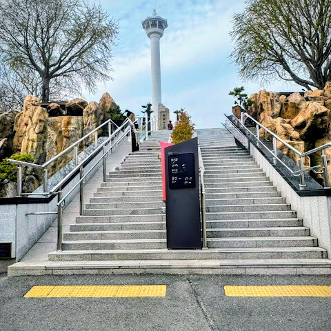 걸어서 올라갈 수도 있고, 롯데백화점에서 에스컬레이터를 이용할 수도 있습니다. 정상에는 한국 해군 이순신 장군의 동상과 유명한 부산타워가 있습니다.