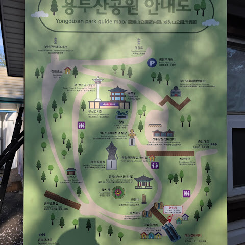 아름다운 공원이에요! 여기서 멋진 사진을 많이 찍을 수 있어요. 한두 시간이면 충분할 거예요. 남포롯데역에서 지하철을 타고 에스컬레이터를 타고 올라가면 유명한 쇼핑 거리(광복로)가 나옵니다.