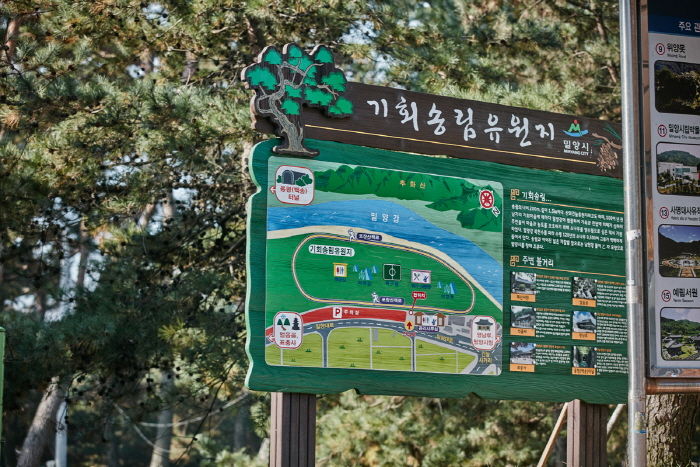 기회송림은 밀양시 교동 동북쪽에 밀양천을 따라 너비200m, 길이 1,500m에 이르는 숲대를 말한다. 120년 된 소나무 9천5백여 그루가 빽빽하게 들어서 있는 모습이 장관이다. 송림 앞으로 밀양강 북천수가 새 을(乙)자 형상으로 맑게 흐르고 있어, 야영과 휴양을 위한 관광객으로 많이 붐빈다. 특히 여름철에는 산외면에서 유원지 안에 야외극장을 개설하여 공연한다. 주변에 빈지소유원지, 얼음골, 영남루, 용두원유원지, 표충사, 영남루, 만어사, 언양 자수정동굴나라 등의 관광지가 있다. * 기회송림의 유래와 역사 * 100여년 전 남기리 기회마을에 해마다 밀양강이 범람하여 가옥과 전답에 피해가 심하자 주민들이 마을과 농토를 보호하기 위해 소나무를 방수림으로 심은 데서 기원하였다. 밀양강 북천수를 따라 수령 120년의 소나무 9,500여 그루가 빽빽하게 들어서 있다. 송림과 이어진 넓은 자갈밭 앞으로는 남천강 물이 乙자 모양으로 밀양시를 향해 흐른다.