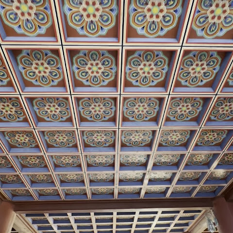 대웅전의 목조 내부 장식은 조선 후기 불교 건축의 "장엄" 사상을 잘 보여줍니다. 특히 불상 위의 대집은 마치 작은 궁궐(집 안의 집)처럼 보입니다. 정교하게 쌓아 올린 받침대와 생동감 넘치는 용머리, 날아오르는 극락조의 조각은 신성한 "천상궁"의 이미지를 형성하여 부처님의 거처와 세속을 공간적으로 구분 짓고 있습니다.