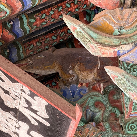 근낙전 처마 밑에는 돼지 조형물이 있습니다. 위를 올려다보세요.