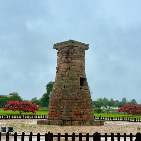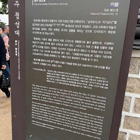 이곳은 세계에서 유일하게 남아 있는 첨성대로, 현존하는 가장 오래된 유적지입니다. 신라 시대에 건설되었으며, 약 1,300년 전으로 추정됩니다. 한국 드라마 "선덕여왕"을 보셨다면 이 기념비에 더욱 깊은 인상을 받으실지도 모릅니다.