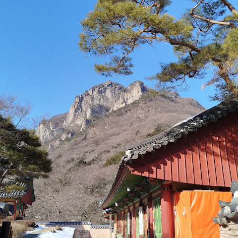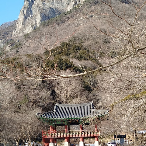 사찰 경내 바로 뒤로 솟아오른 산의 웅장한 암벽과 부드러운 겨울 단풍은 마치 영화 한 장면 같아요. 하늘도 정말 드넓게 펼쳐져 있고요. 공기는 정말 맑고 깨끗해서 몇 분만 걸어도 폐가 개운해지는 느낌이 들어요. 조용하고 평화로우며, 관광객으로 북적이지도 않아서 더욱 좋습니다.