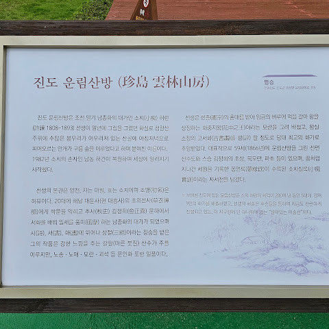 |  남종화의 대가 소치 허련이 고향에서 초가를 짓고 운림각이라는 화실을 만들어 여생을 보낸 곳.. 그 후 아들 미산 허형과 손자 남농 허건 등 5대에 걸쳐 화풍이 이어지고 있다