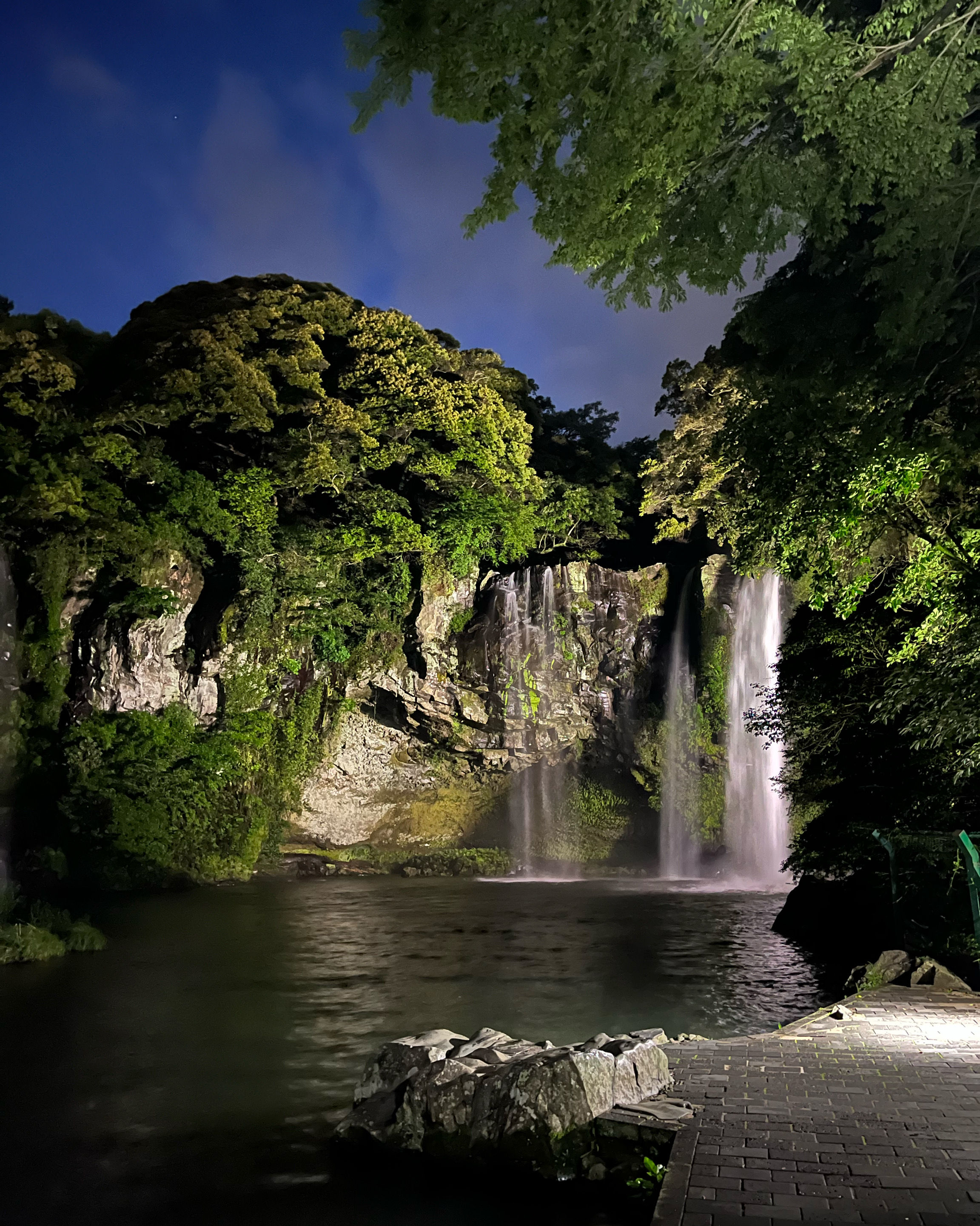 보통 폭포를 보려면 계단을 내려가거나 낮시간 방문인데 천지연 폭포는 평지길에(유모차 가능) 늦은시간까지 예쁜조명과 함께 관람이 가능해요