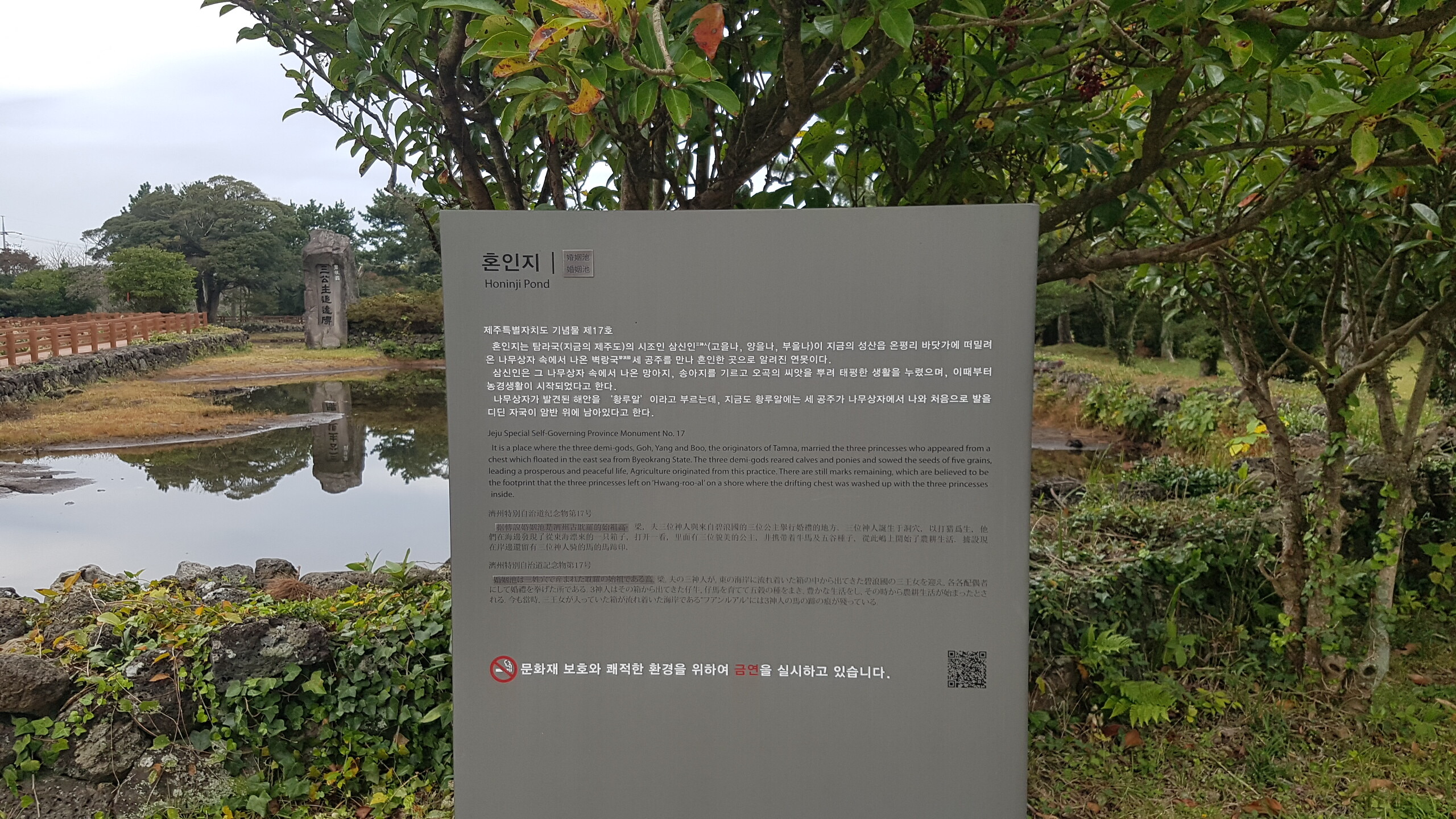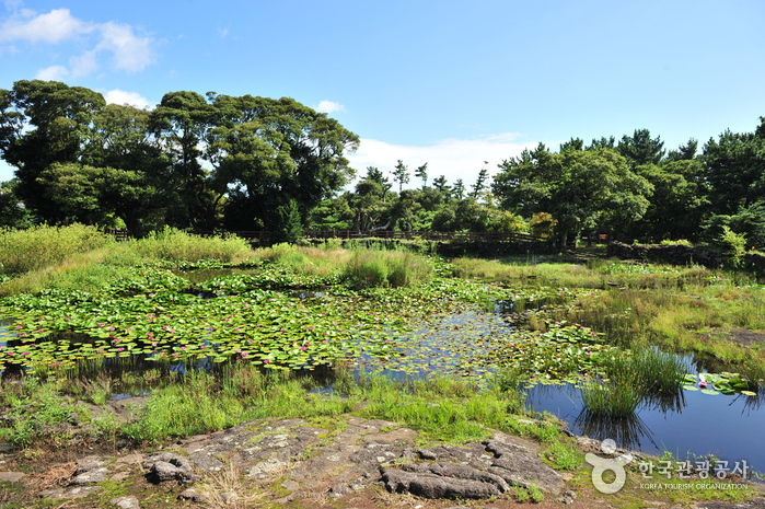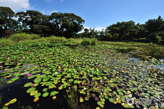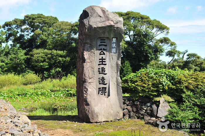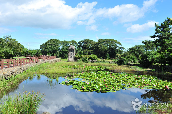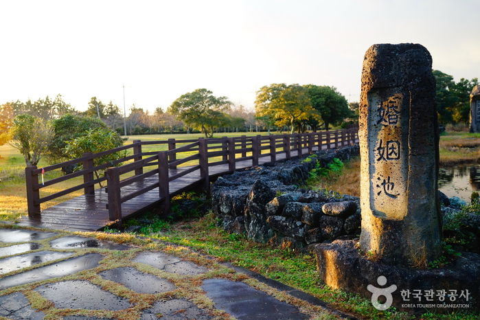 삼성혈에서 태어난 탐라의 시조 고.양.부 3신이 수렵생활을 하며 지내다가 동쪽나라(벽랑국)에서 온 세 공주와 합동혼례를 올렸다는 조그마한 연못이다. 얕고 작은 연못에 불과하지만, 삼신인이 이곳에서 혼례를 올림으로써 비로소 제주민이 늘어나고 농사가 시작되었다 한다. 혼인지 바로 옆에는 삼신인이 혼례를 올린 후 신방을 차렸던 조그만 굴이 있는데, 그 굴이 세 갈래로 되어 있어 순전히 전설만은 아닌 듯하다. 이곳은 삼성혈과 함께 제주도 시조의 자취를 더듬어 보기 좋은 곳으로 여름철에 피어나는 붉은 연꽃은 노을처럼 곱기만 하다.