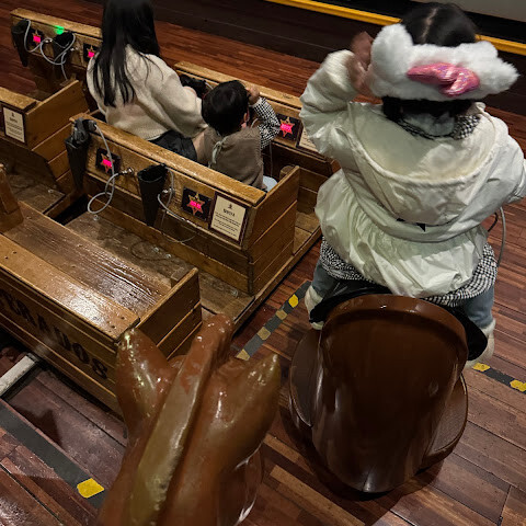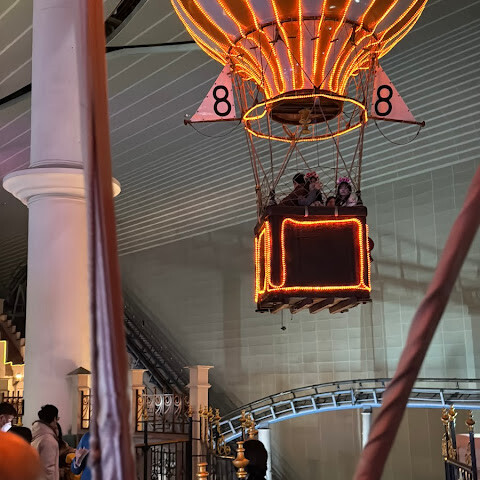 저희는 네 살, 일곱 살 아이 둘이 있어요. 네 살 아이는 키가 100cm도 안 돼서 몇몇 놀이기구는 탈 수 없었어요. 하지만 생각보다 탈 수 있는 놀이기구가 꽤 많았어요. 1층에는 회전목마, 볼풀, 서부식 슈팅 게임이 있고, 3층에는 미니 기차가 있어요. 4층에서는 열기구를 탈 수 있는데, 대기 시간이 한 시간 정도 걸리고 저녁 7시 이후에는 입장이 제한되는 것 같아요. 야외 성 구역에는 놀이기구가 두 개 있는데, 하나는 빙글빙글 도는 작은 자동차 놀이기구로 좀 지루했고, 다른 하나는 사탕집처럼 생긴 놀이 공간으로 좀 더 재밌었어요.