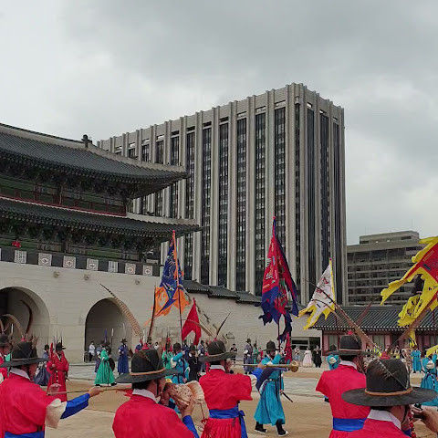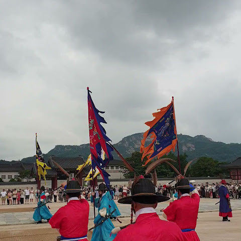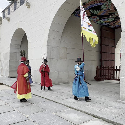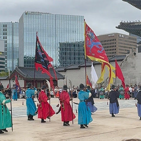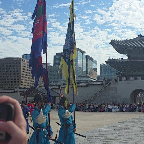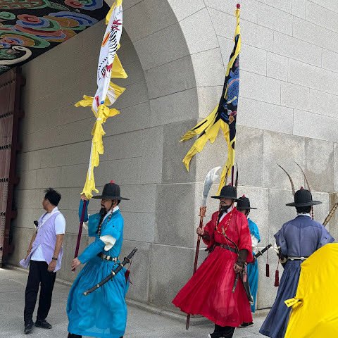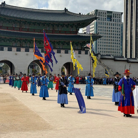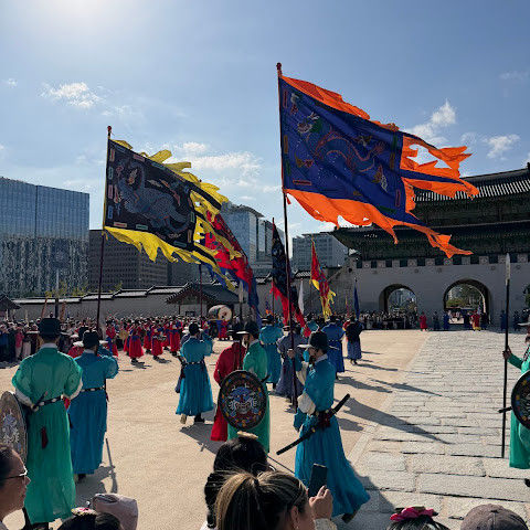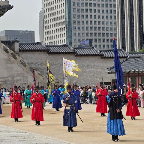 경복궁은 정말 웅장해요. 수문장 교대식은 매우 화려하고 정교해요.