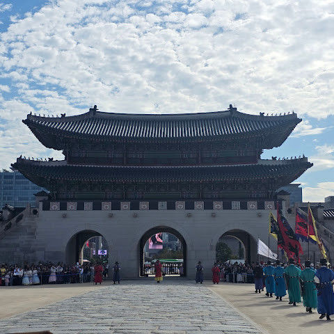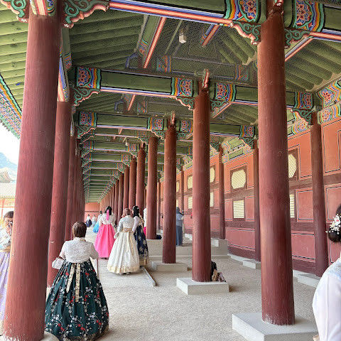 꼭 방문해야 할 역사 유적지! 궁궐과 주변 경내는 정말 넓어서 정말 매료되었어요. 운 좋게 시간(오전 10시나 오후 2시)에 가면 수문장 교대식을 볼 수 있어요. 저도 이 행사를 정말 즐겼어요. 행사 진행 과정에 대한 해설도 들을 수 있었는데, 흥미로운 역사를 배울 수 있었던 것 같아요. 무료 가이드 투어가 하루 종일 진행되지만 아쉽게도 시간이 없어서 참여하지 못했어요. 전통 한복을 입어보고 싶으신 분들을 위해 궁궐 주변에 한복을 대여해 주는 전통 세관도 많이 있어요.