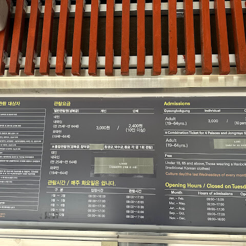 경복궁에서는 하루에 두 번 수문장 교대식이 거행됩니다. 경복궁에는 국립민속박물관과 국립고궁박물관이 있습니다. 경복궁은 경복궁역에서 갈 수 있습니다. 일 년 중 일부 기간에는 야간 개장합니다. 한복을 입고 오시는 분은 무료로 입장하실 수 있습니다.