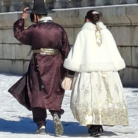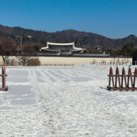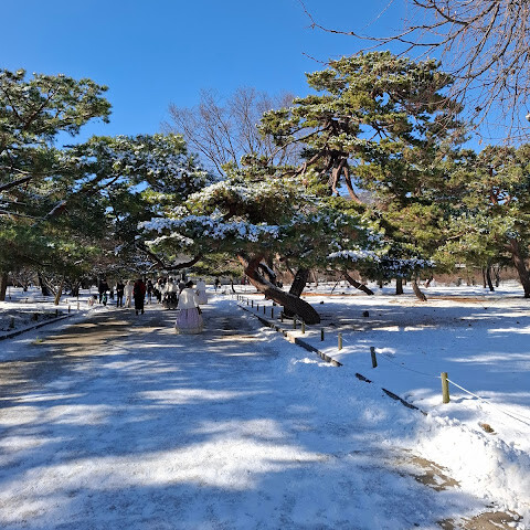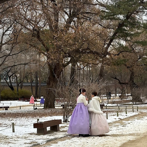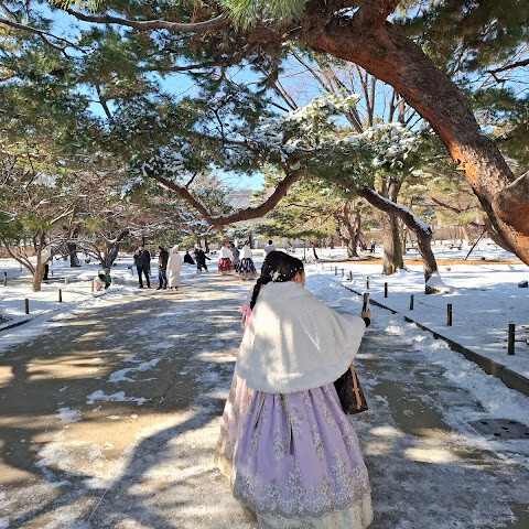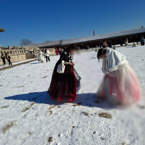 일부 지역에는 눈 덮인 지붕이 있습니다. 신사 숙녀분들은 전통 한복을 입고, 눈 덮인 지붕과 땅은 그 느낌을 더합니다.