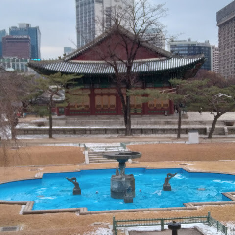 서울을 대표하는 매우 아름다운 궁궐로, 자유롭게 거닐 수 있으며, 궁궐을 더욱 아름답게 보이게 하는 작은 분수도 있습니다.