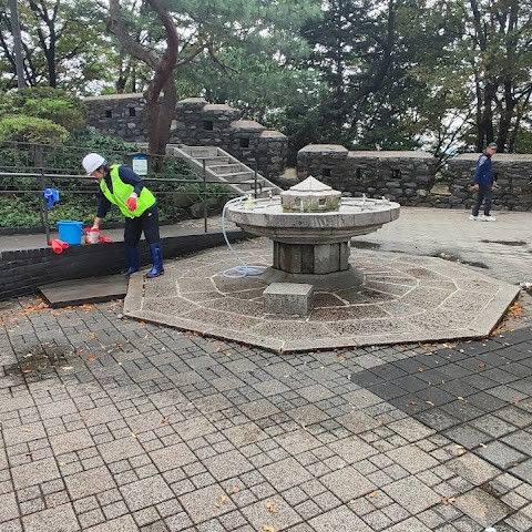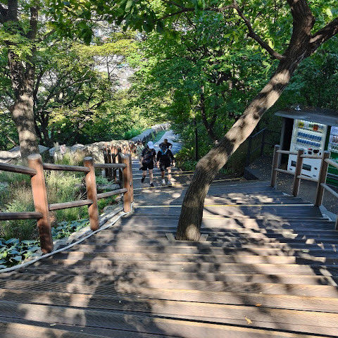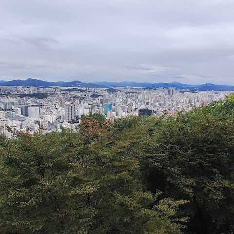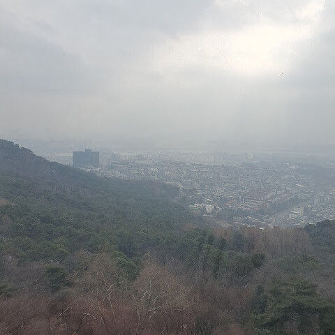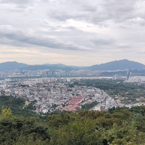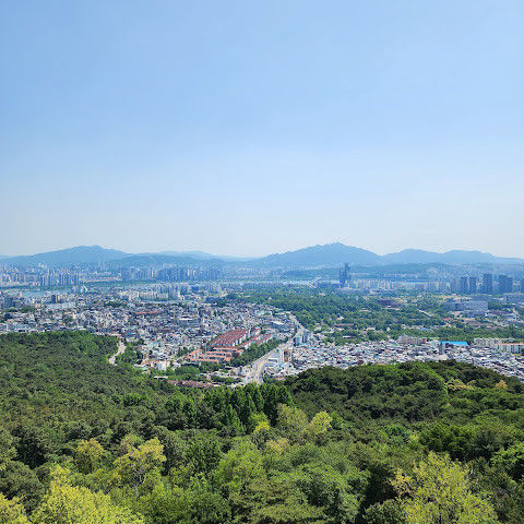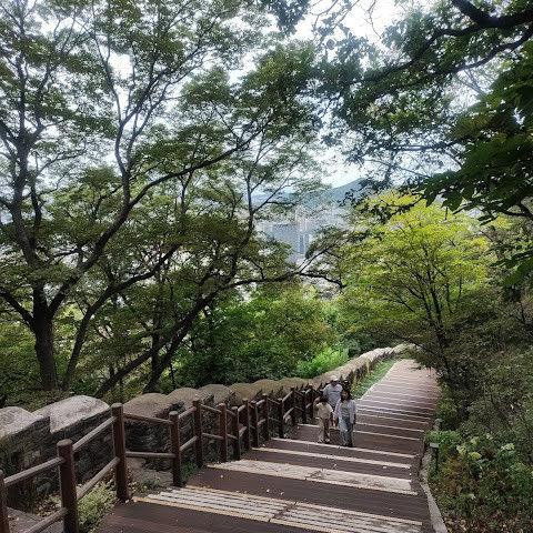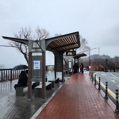 버스 정류장에서 10분 정도 올라가면 됩니다. 꼭대기에서 서울의 아름다운 전망을 감상하실 수 있습니다.