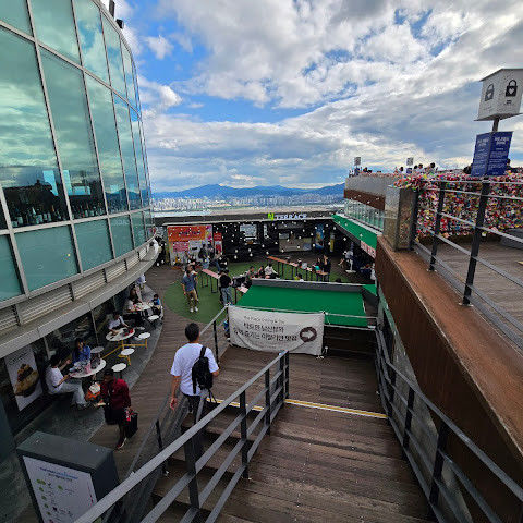 특히 남산 케이블카를 타면 더욱 그렇습니다(물론 케이블카는 좀 더 편하게 이용할 수 있습니다). 정상에 오르면 타워 주변은 활기 넘치지만 부담스럽지 않은 좋은 분위기로 가득합니다. 카페, 기념품 가게, 심지어 경치를 감상하며 식사를 하거나 휴식을 취할 수 있는 곳도 있습니다.