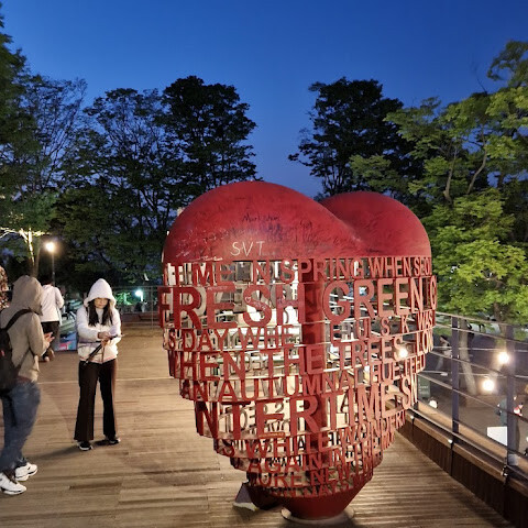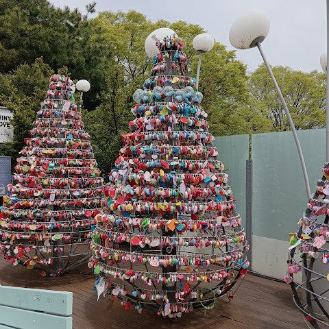 서울타워! 남산공원에서 나무계단을 타고 올라갈 수 있어요! 하지만 체력이 약하거나 걷기 힘들다면, 길을 따라 걸어 올라가는 걸 추천해요! 하지만 길이 꽤 가파르고 구불구불하답니다! 걷기 싫다면 버스나 케이블카를 이용하는 것도 좋은 방법이에요! 서울타워에는 세븐일레븐, GS25 등 다양한 편의점이 있고, 서울의 멋진 전경도 감상할 수 있어요! 사랑의 자물쇠가 수십만 개, 아니 그보다 더 많이 걸려 있을 거예요! 정말 장관이랍니다! 사랑의 자물쇠를 걸어보고 싶다면 미리 준비하는 게 좋아요!