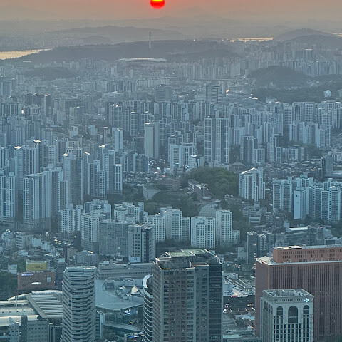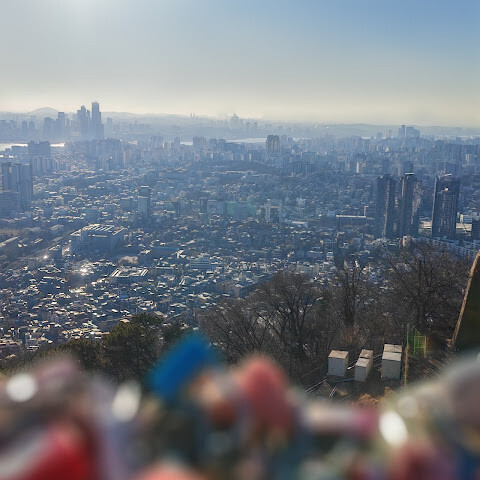 타워 꼭대기에서 바라보는 서울의 아름다운 전경. 서울을 방문하는 관광객이라면 꼭 사진을 찍어야 할 명소입니다.