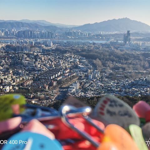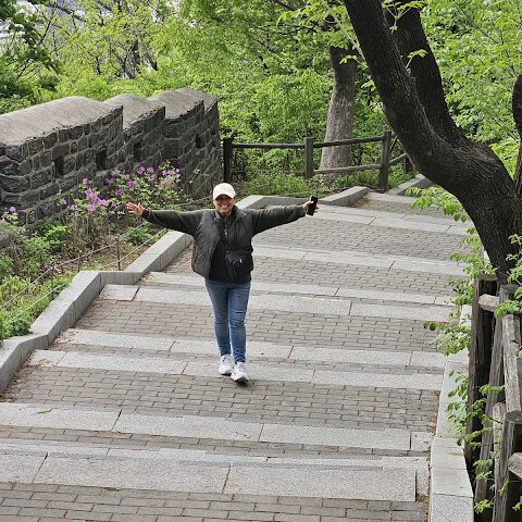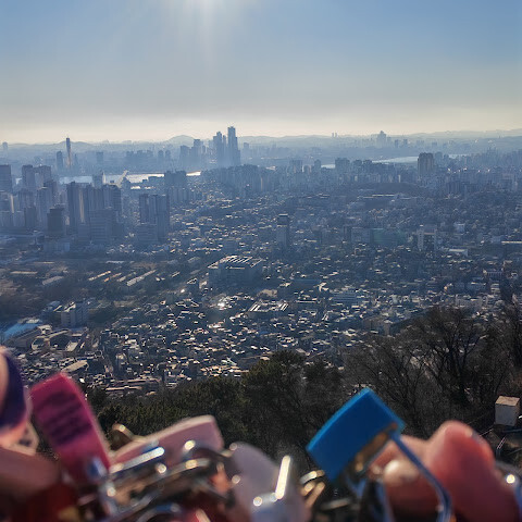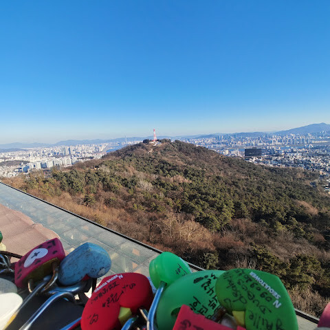계단 (왼쪽으로 가서 954개의 계단을 오르는 건 정말 힘들었지만 훌륭한 운동이었어요). 정상에서는 멋진 경치를 감상할 수 있었고, 인왕산도 볼 수 있었어요.