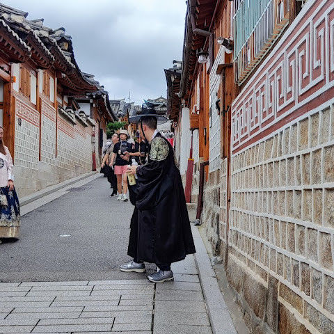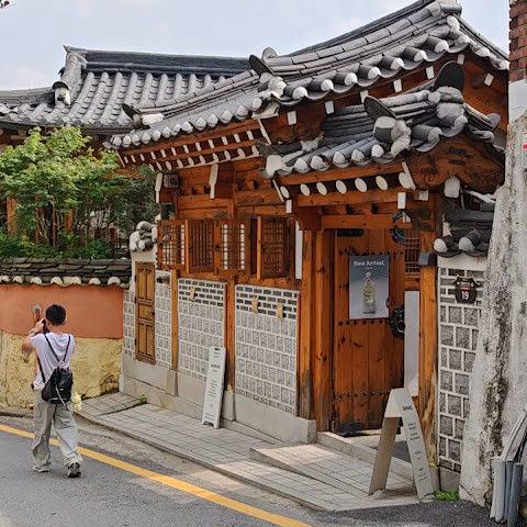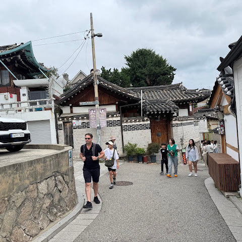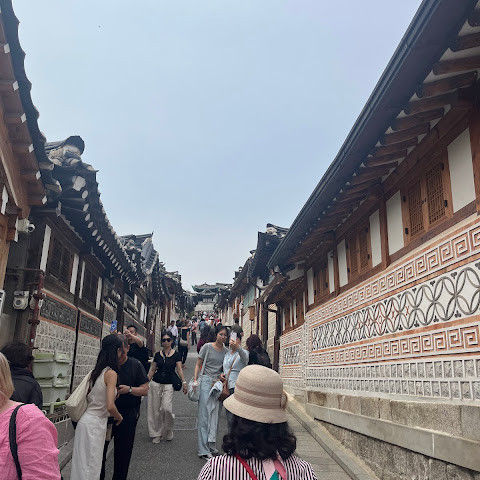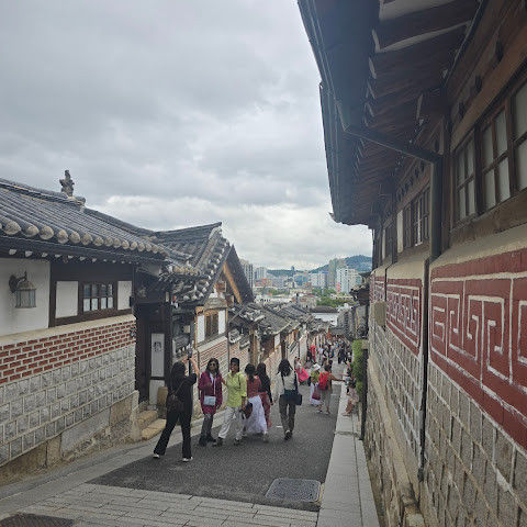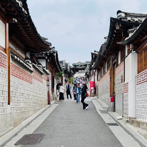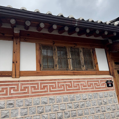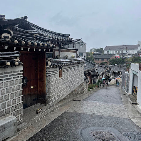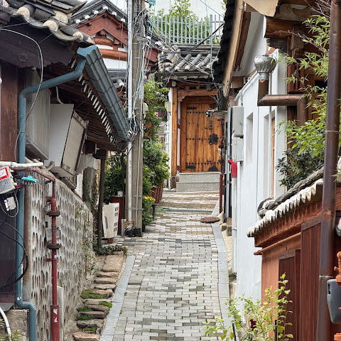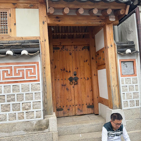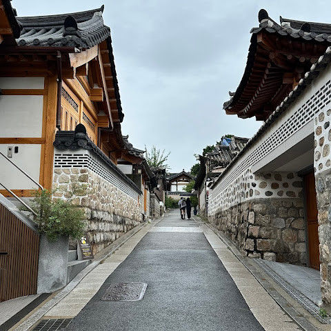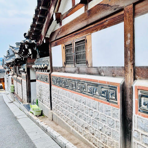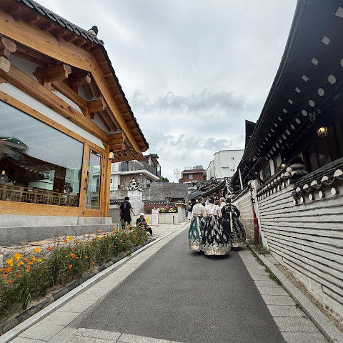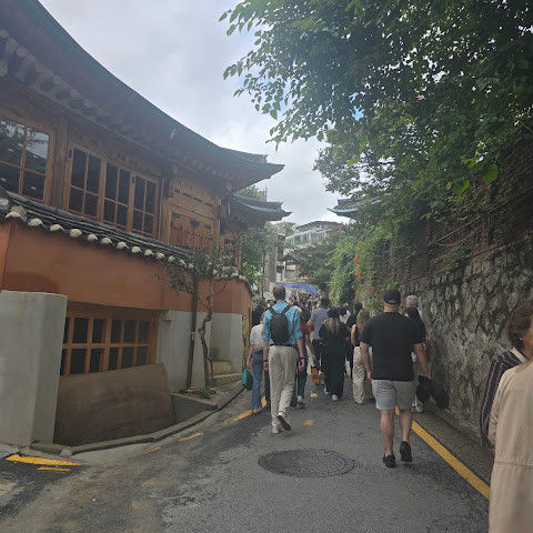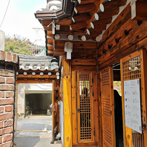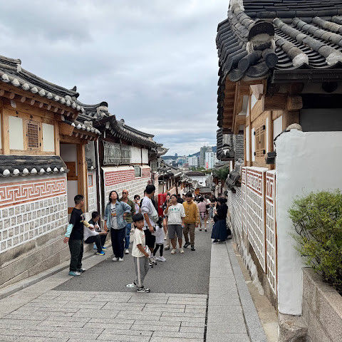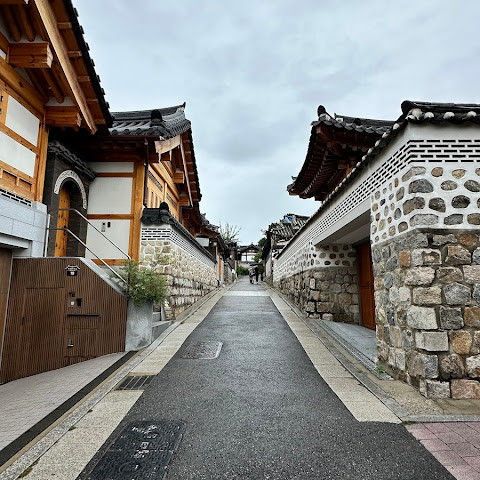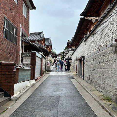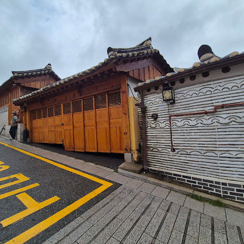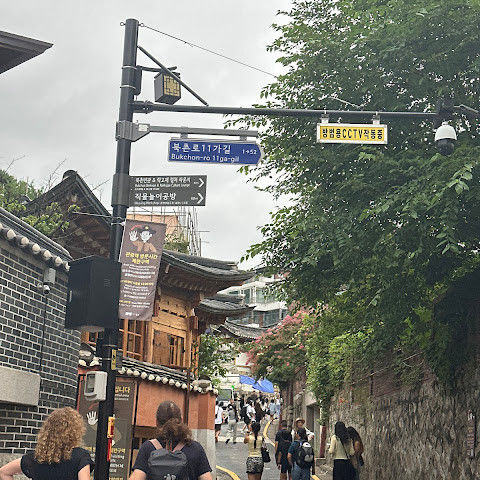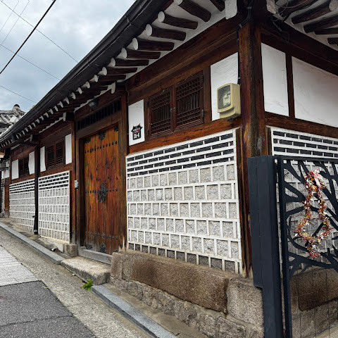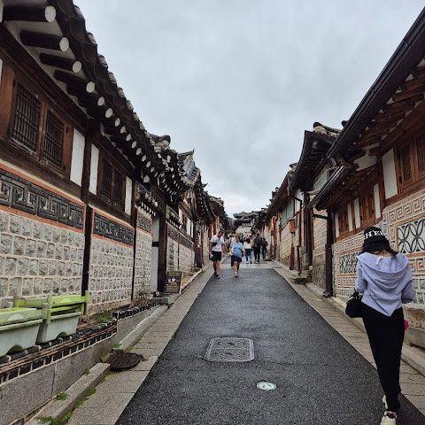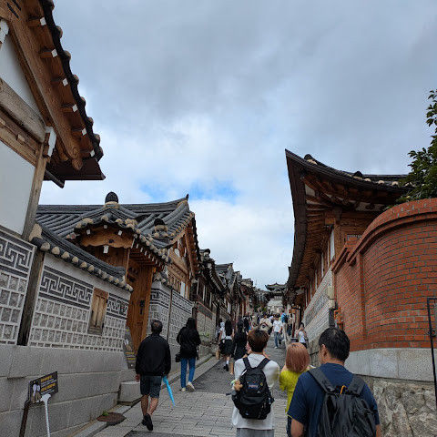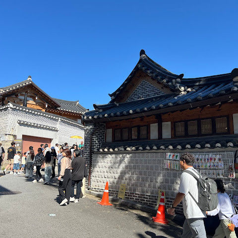 북촌 한옥마을에는 전통 한옥들이 많이 있는데, 이 건물들은 식당, 상점, 또는 기타 시설로 개조되어 있습니다. 과거에 지어진 집들도 있는데, 지금도 그 가족들이 살고 있습니다. 많은 식당 앞에는 긴 줄이 늘어서 있습니다. 이 지역을 걸으며 옛 건물들을 많이 보면서 이곳에 대해 꽤 많은 것을 알게 되었습니다.