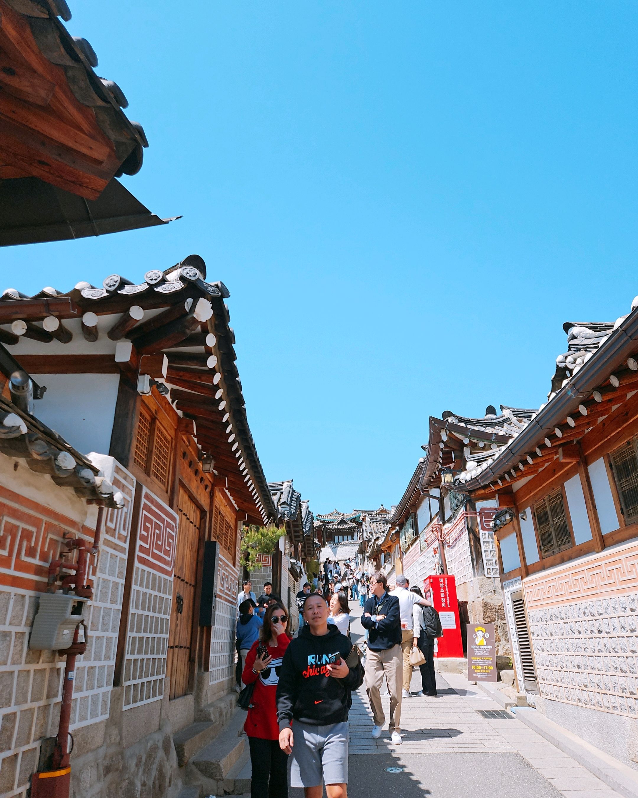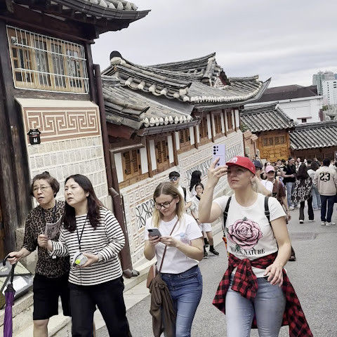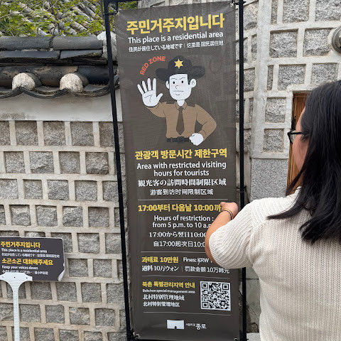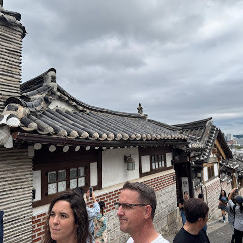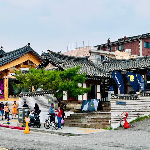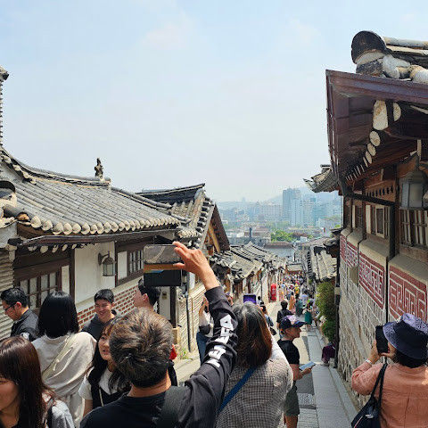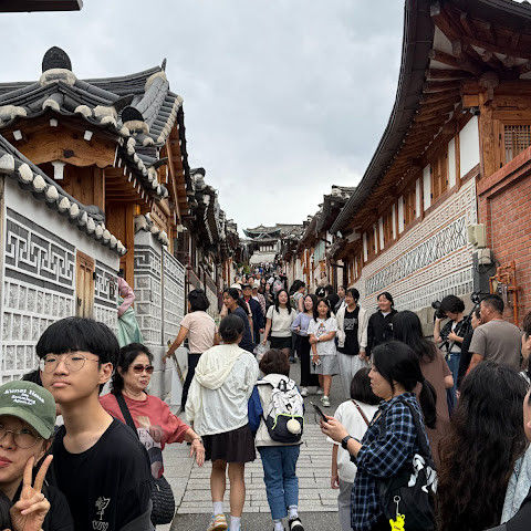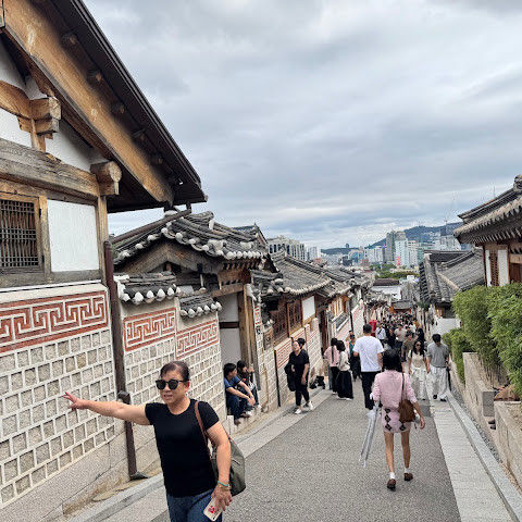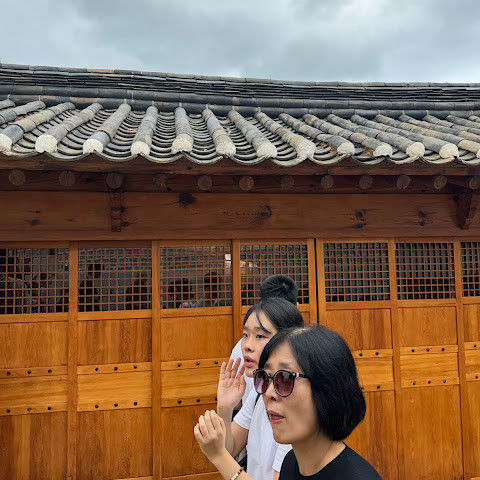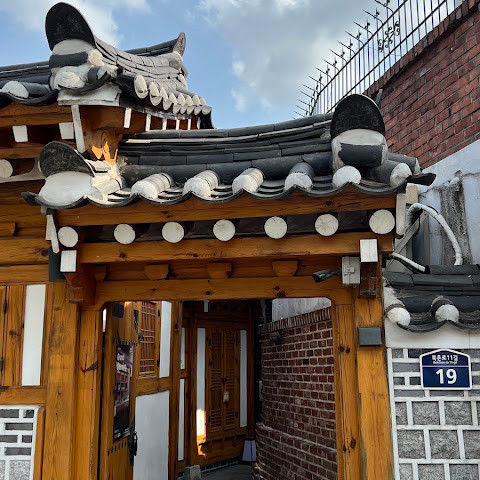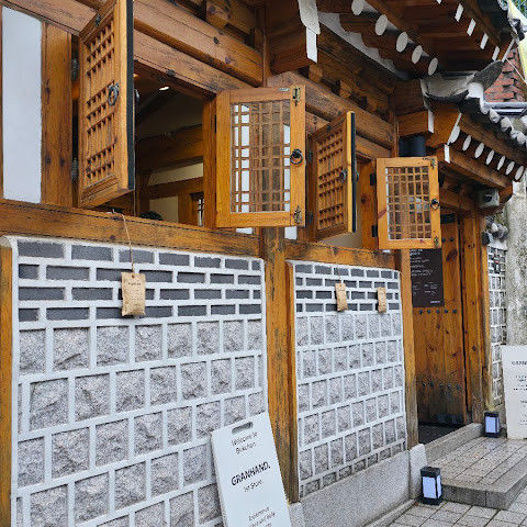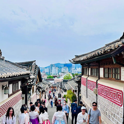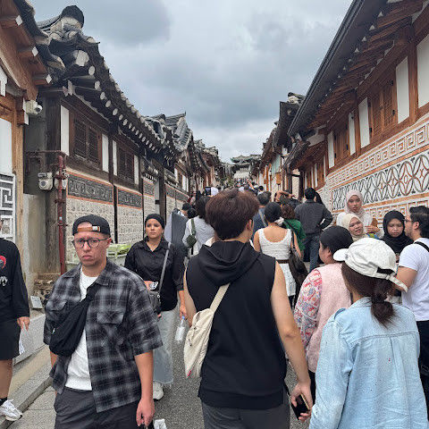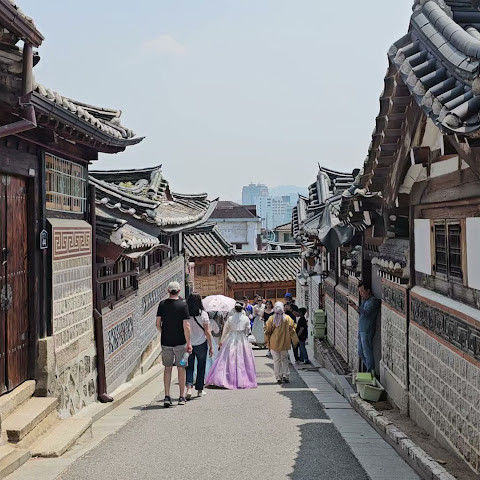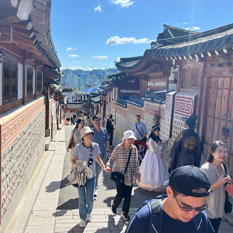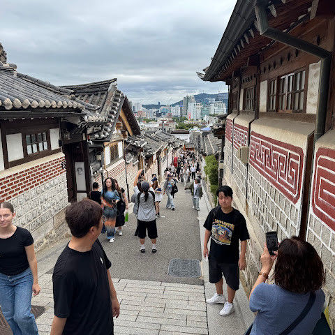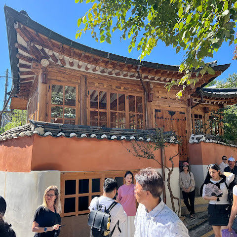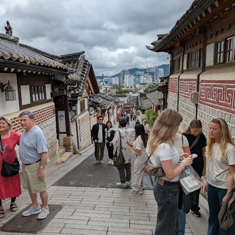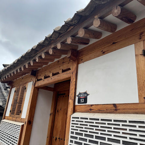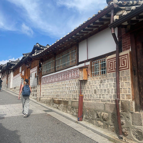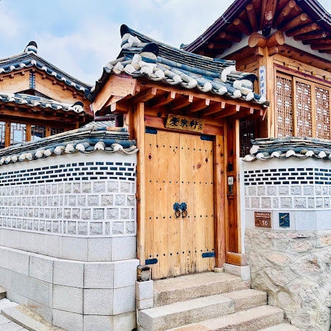 북촌 한옥마을에는 전통 한옥들이 많이 있는데, 이 건물들은 식당, 상점, 또는 기타 시설로 개조되어 있습니다. 과거에 지어진 집들도 있는데, 지금도 그 가족들이 살고 있습니다. 많은 식당 앞에는 긴 줄이 늘어서 있습니다. 이 지역을 걸으며 옛 건물들을 많이 보면서 이곳에 대해 꽤 많은 것을 알게 되었습니다.