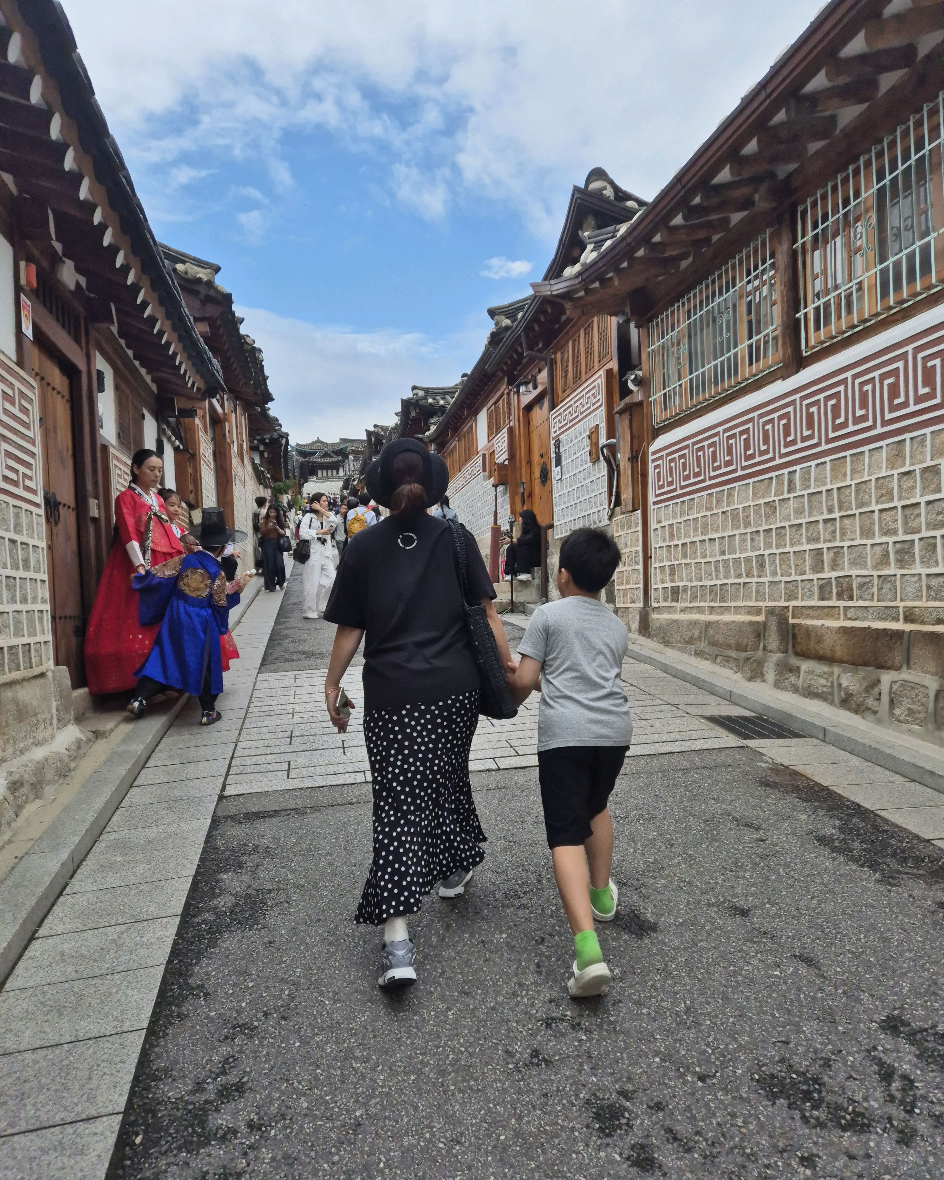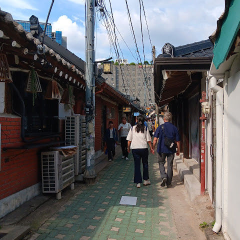 오래된 한옥 사이를 걷는 것은 흥미로웠고, 사람이 많았지만 비교적 조용했습니다.